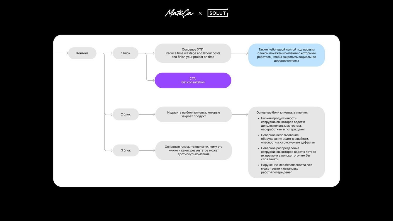 Всего мы разработали 11 блоков с контентом, в каждом — тезис, объяснение выгоды для потенциального клиента Solut и «крючок», чтобы он либо продолжил читать дальше, либо совершил целевое действие.