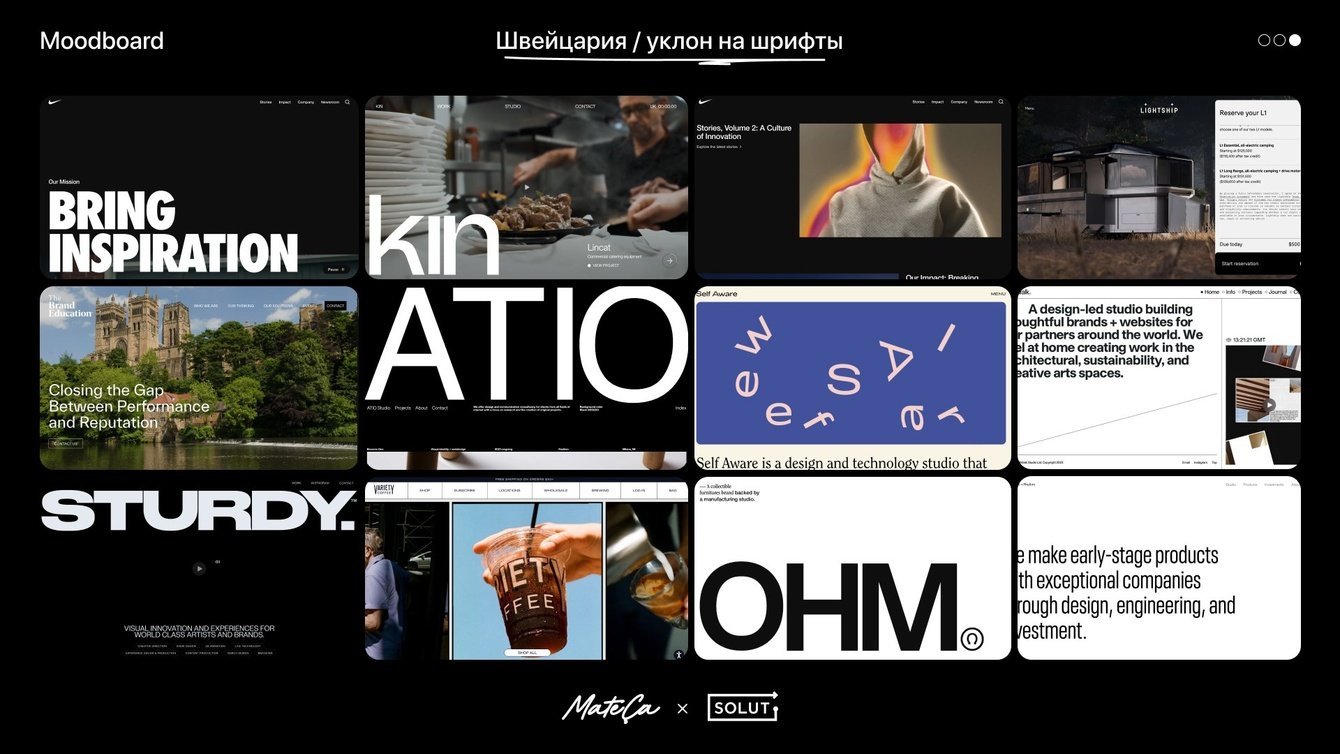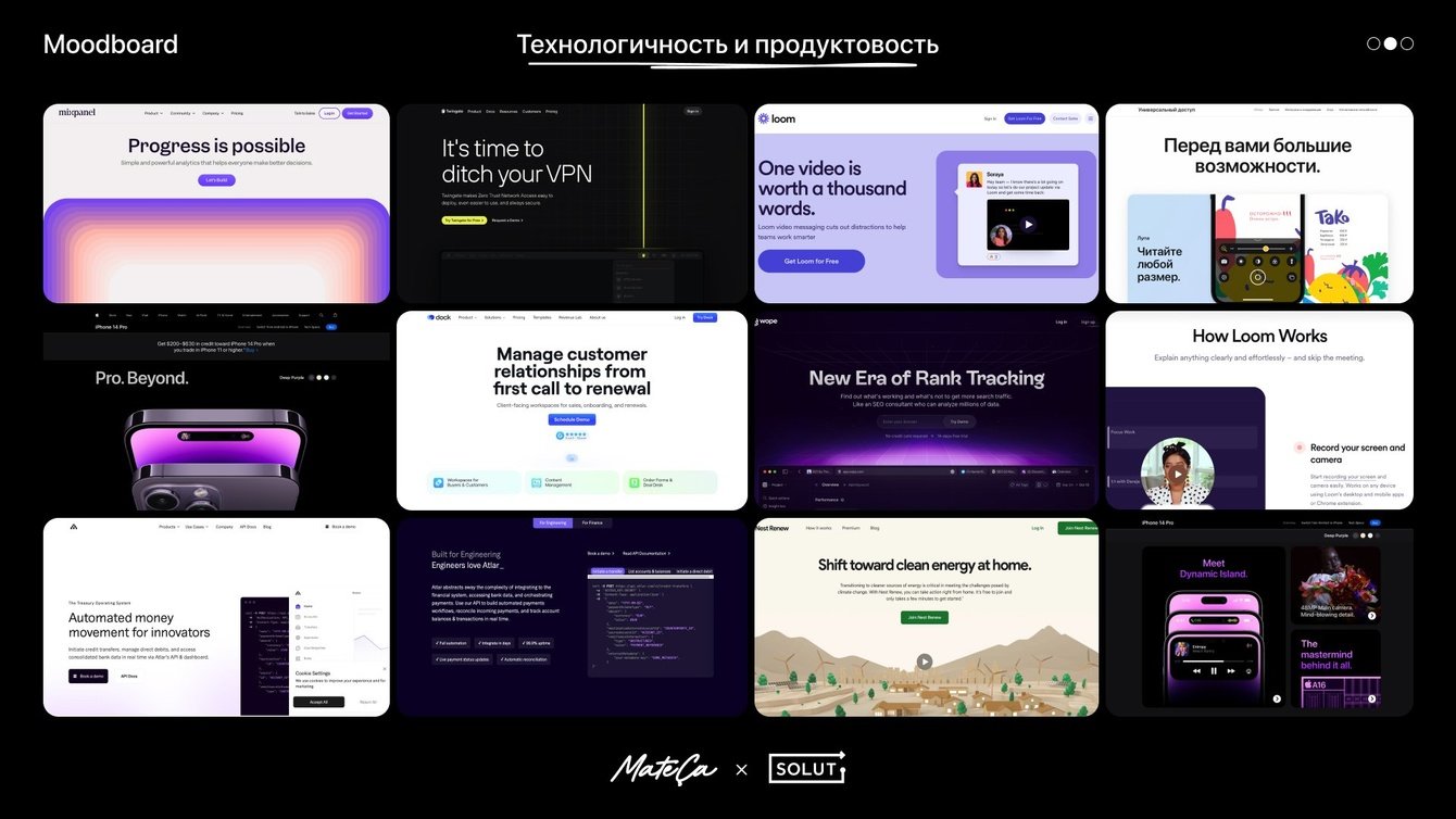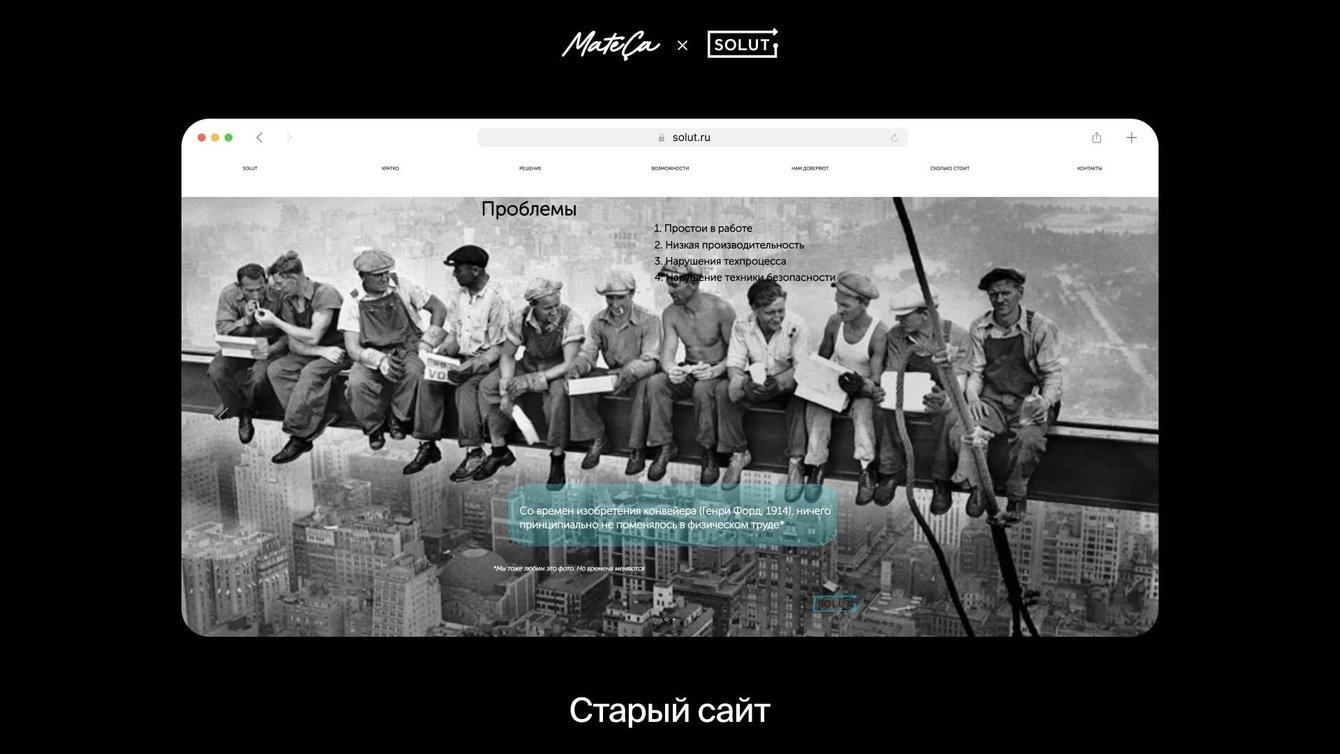 Затем начали изучать общую ситуацию в компании Solut. Главный вывод — визуальная часть, брендинг не соответствует смысловой. Продукт — высокотехнологичный, а дизайн — сильно устаревший.