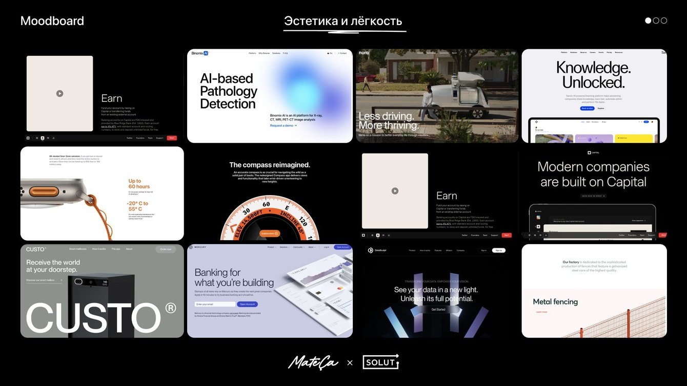 К дизайн-концепту мы приступили после чёрно-белых вариантов. Чтобы ещё раз свериться с ожиданиями заказчика, собрали мудборд с референсами и после этого же начали отрисовывать основные экраны, но уже крупными мазками.