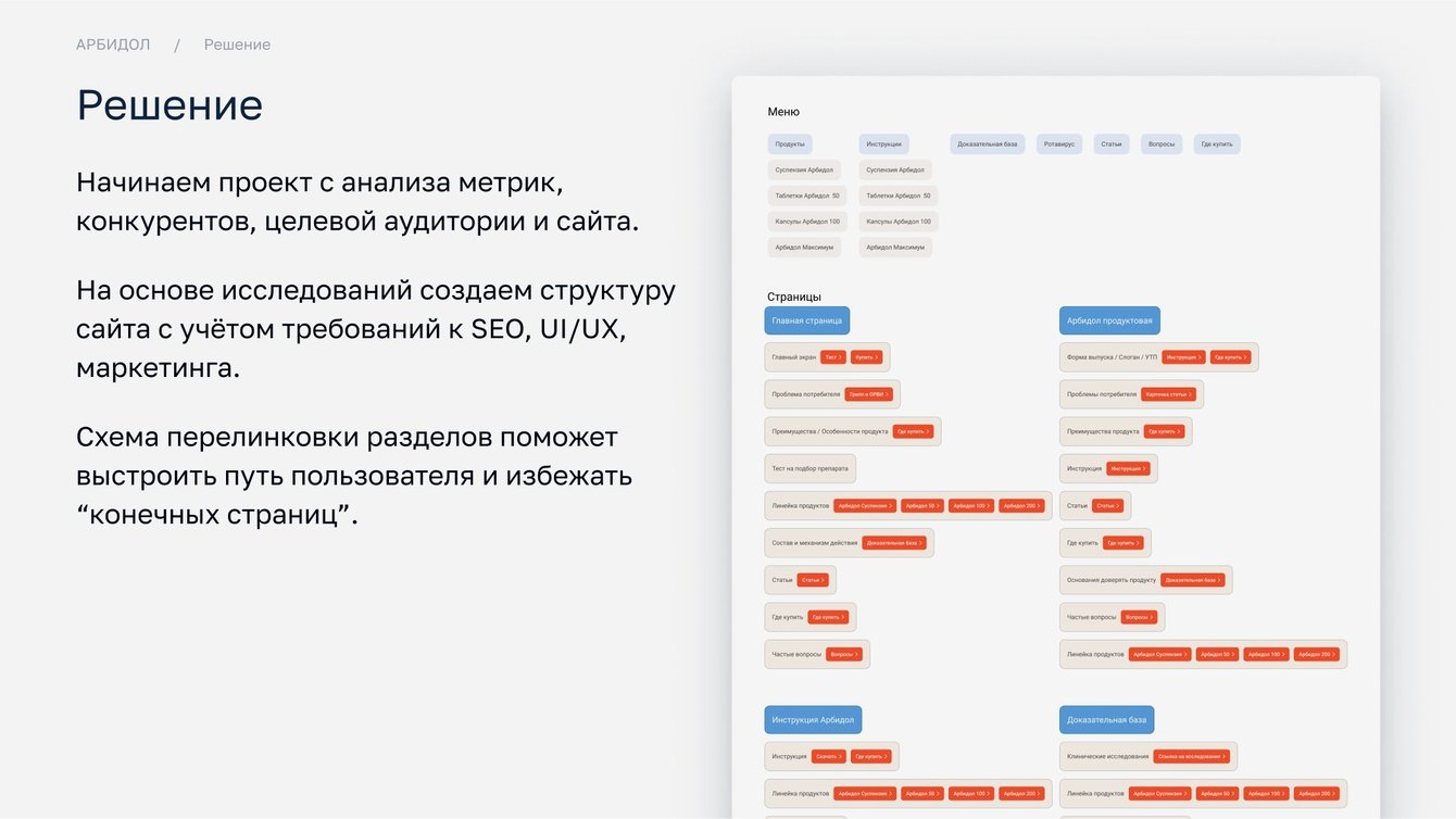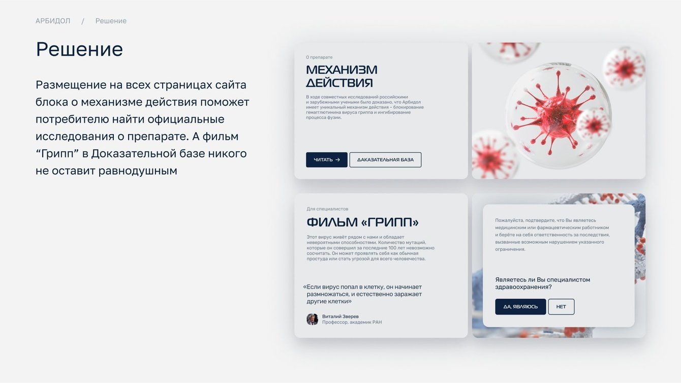 Мы понимали, что для Арбидола, как для бренда №1, важно не просто информировать, но и убеждать. Поэтому доказательная база стала центральным элементом нового сайта.