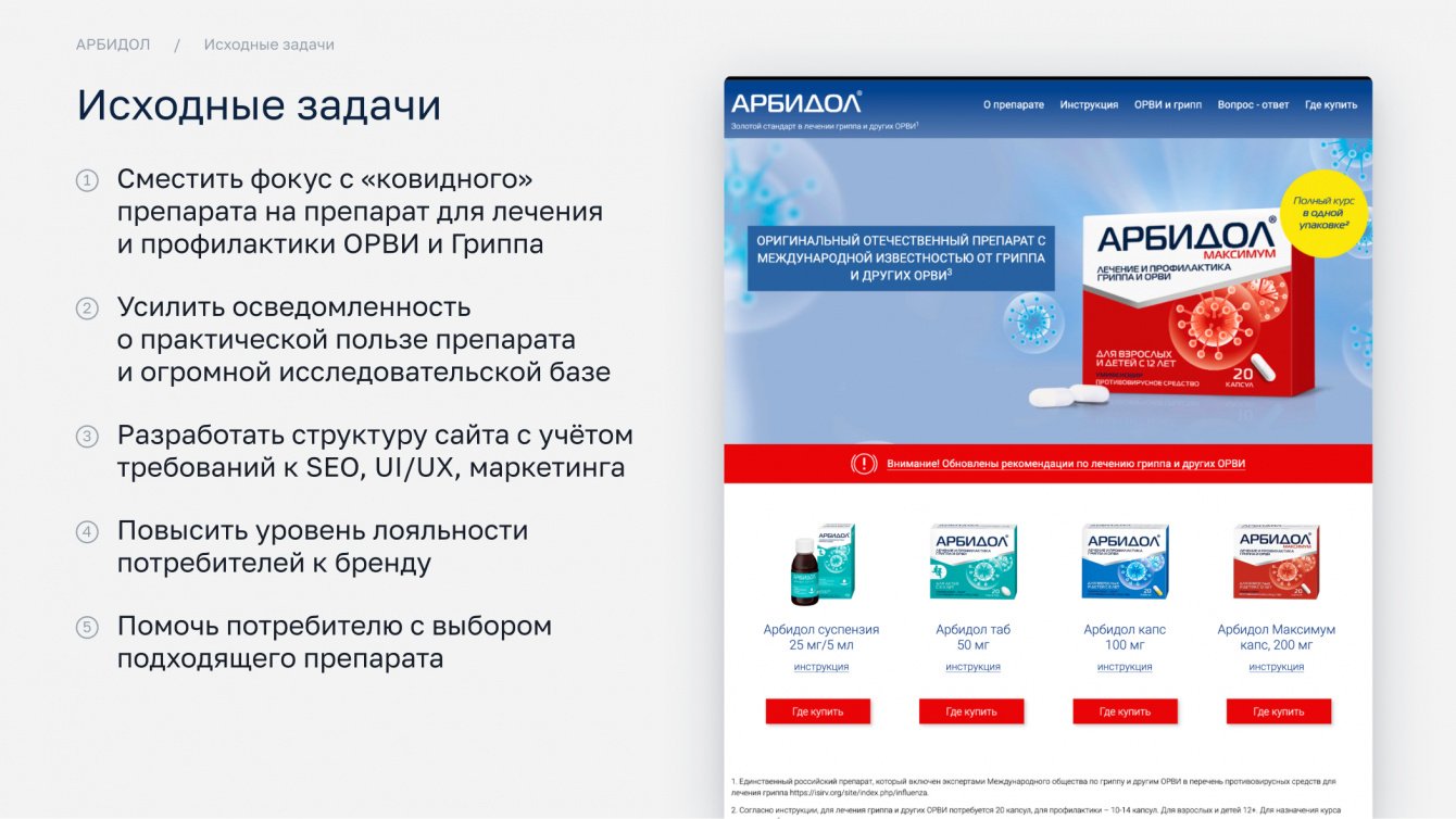 Арбидол — бренд с историей, и его сайт должен был не только выглядеть современно, но и решать конкретные бизнес-задачи.
