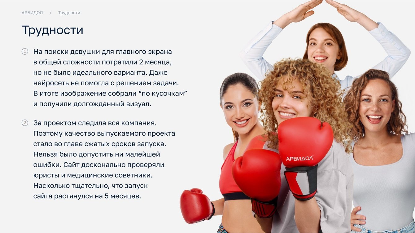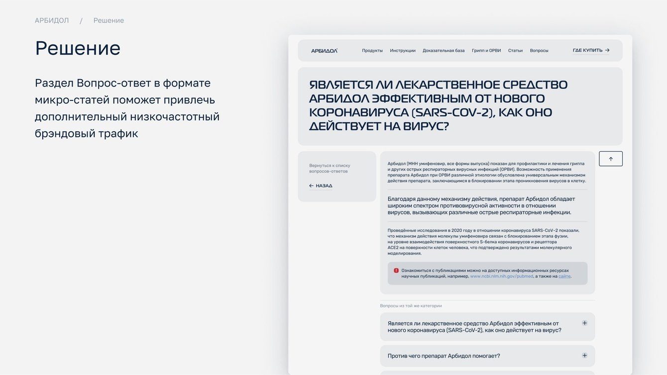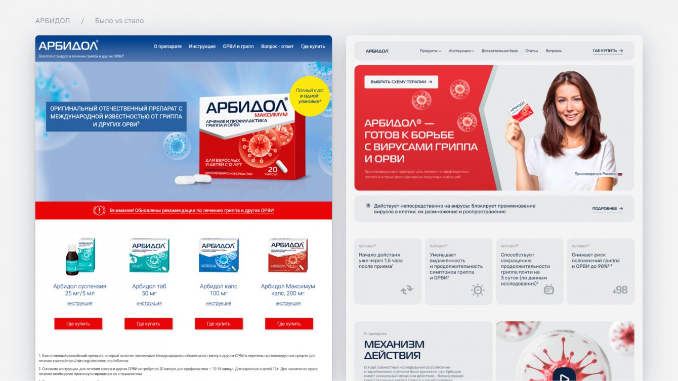 Мы понимали, что для Арбидола, как для бренда №1, важно не просто информировать, но и убеждать. Поэтому доказательная база стала центральным элементом нового сайта.