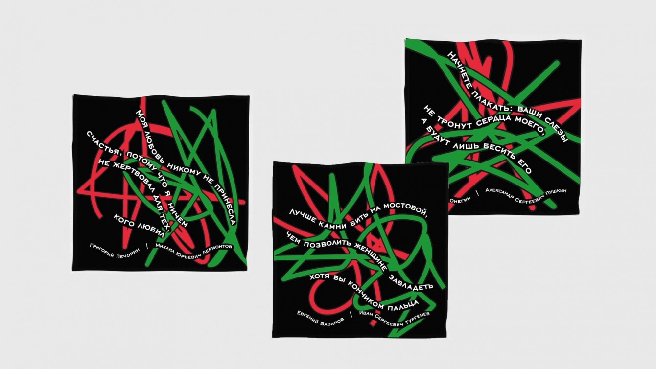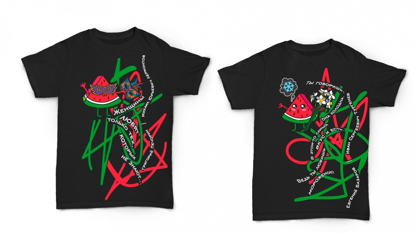 Создать из слов формы и образы, переосмыслить цитаты классиков, дополнить иллюстрациями. За основу принтов взять цитаты и образы из произведений русских классиков: Пушкина, Достоевского, Толстого, Чехова, Гоголя, Тургенева, Лермонтова, Грибоедова, Островского, Гончарова.