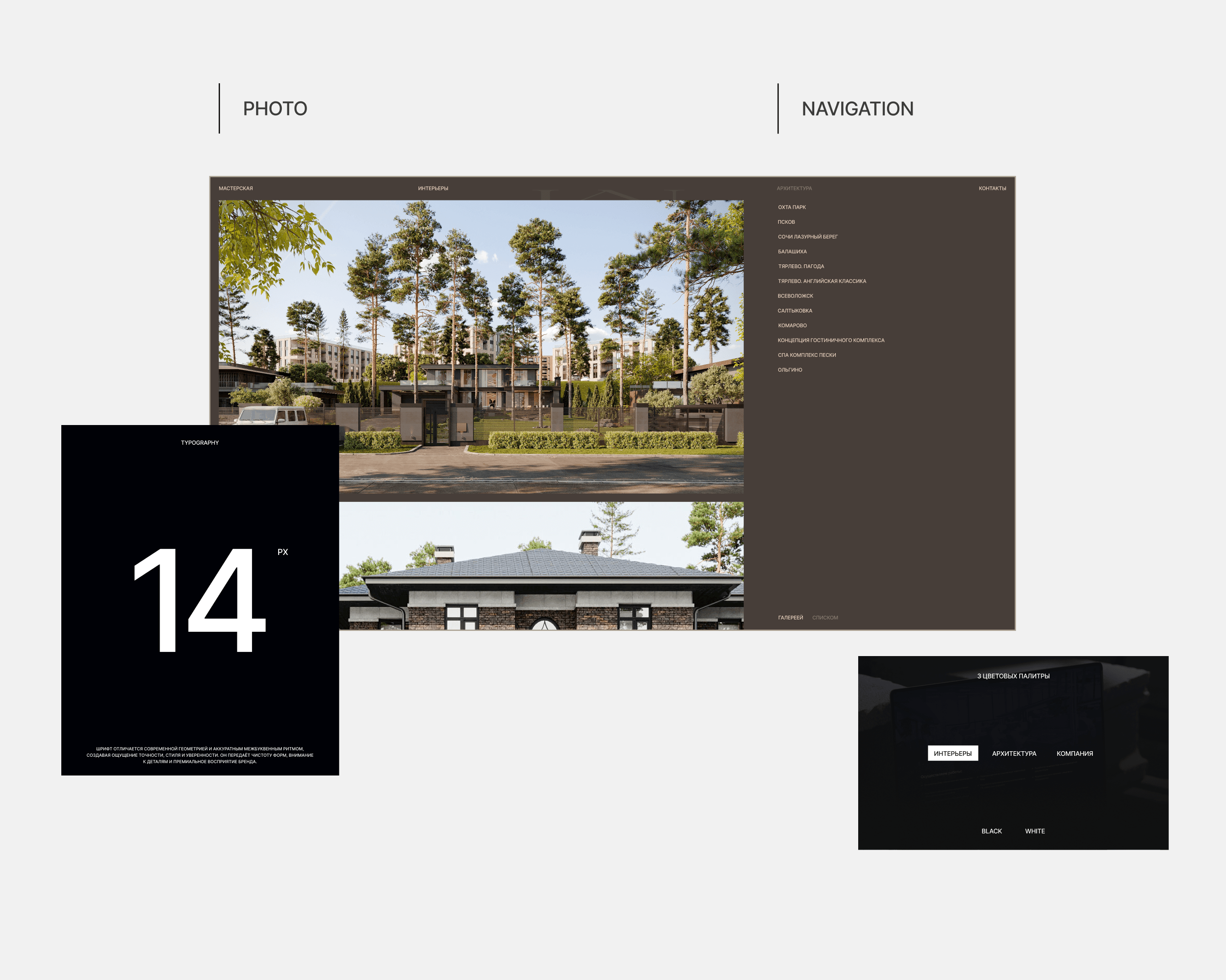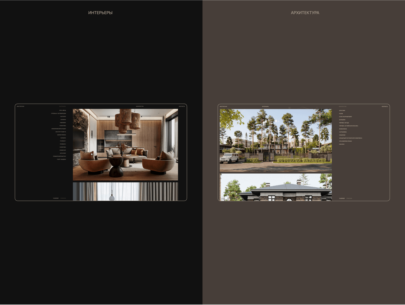 ● Структура предельно упрощена под реальный объём и модель бизнеса: всего два направления (архитектура и интерьеры), минимум фильтров, отдельный раздел «Мастерская», который совмещает раздел о бюро, команду и короткий блог.