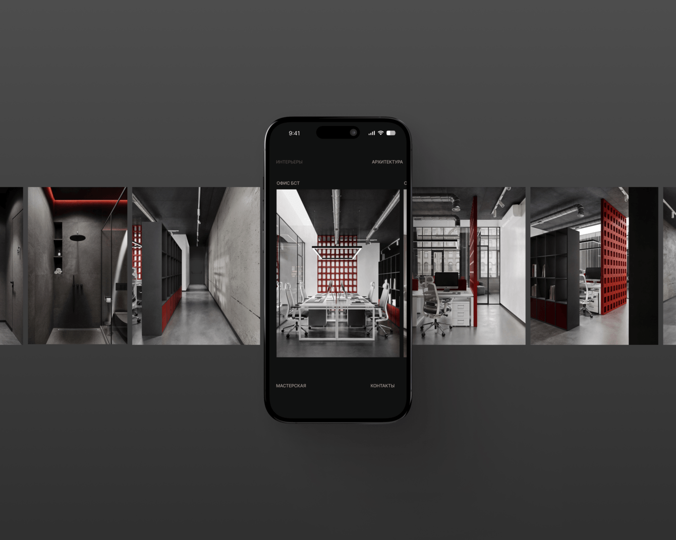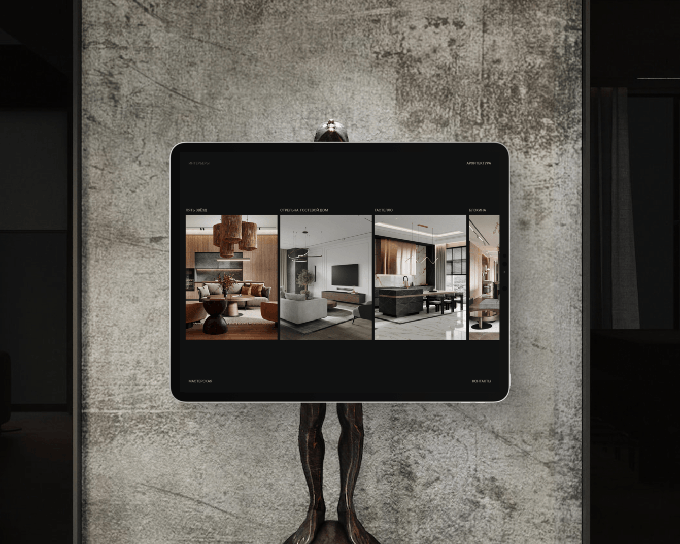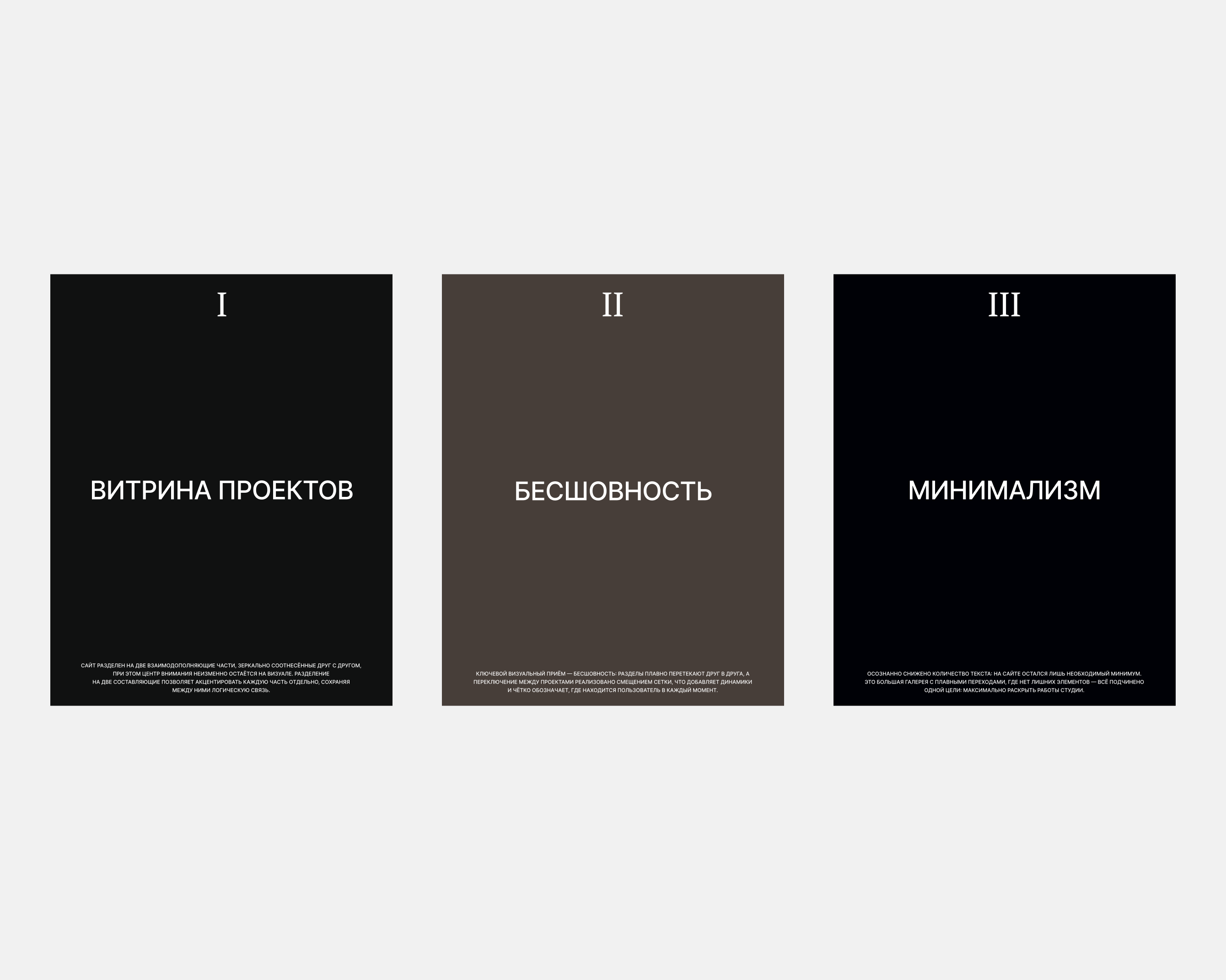 Мы остановились на концепции бесконечной ленты с минимумом текста и максимумом крупных визуалов. Пользователь постоянно остаётся внутри галереи и за несколько минут складывает представление о вкусе и уровне бюро.