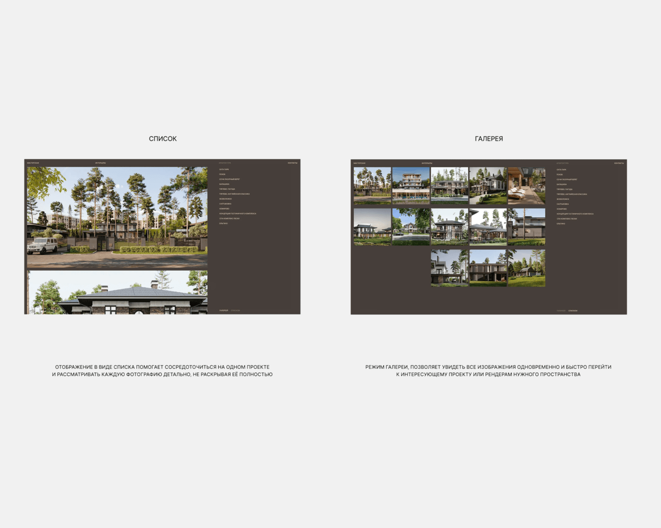 ● Весь акцент сделан на работу с фото и рендерами: больших, демонстрирующих дороговизну изображений много, их можно просматривать несколькими способами – по отдельным проектам, как бесконечную ленту или в режиме просмотра конкретной фотографии.