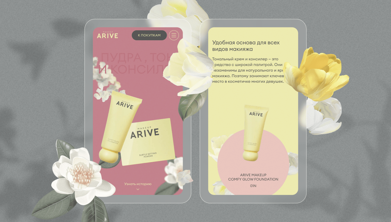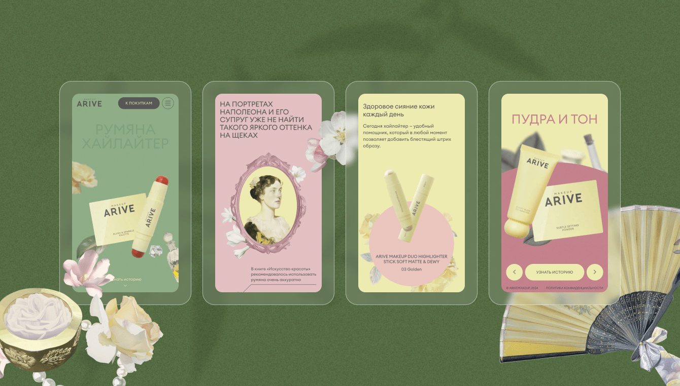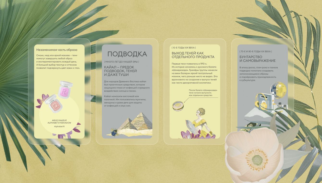Создали промосайт, который представляет продукты Arive Makeup через призму эволюции макияжа от древности до современности и показывает бренд как эксперта в своей области.