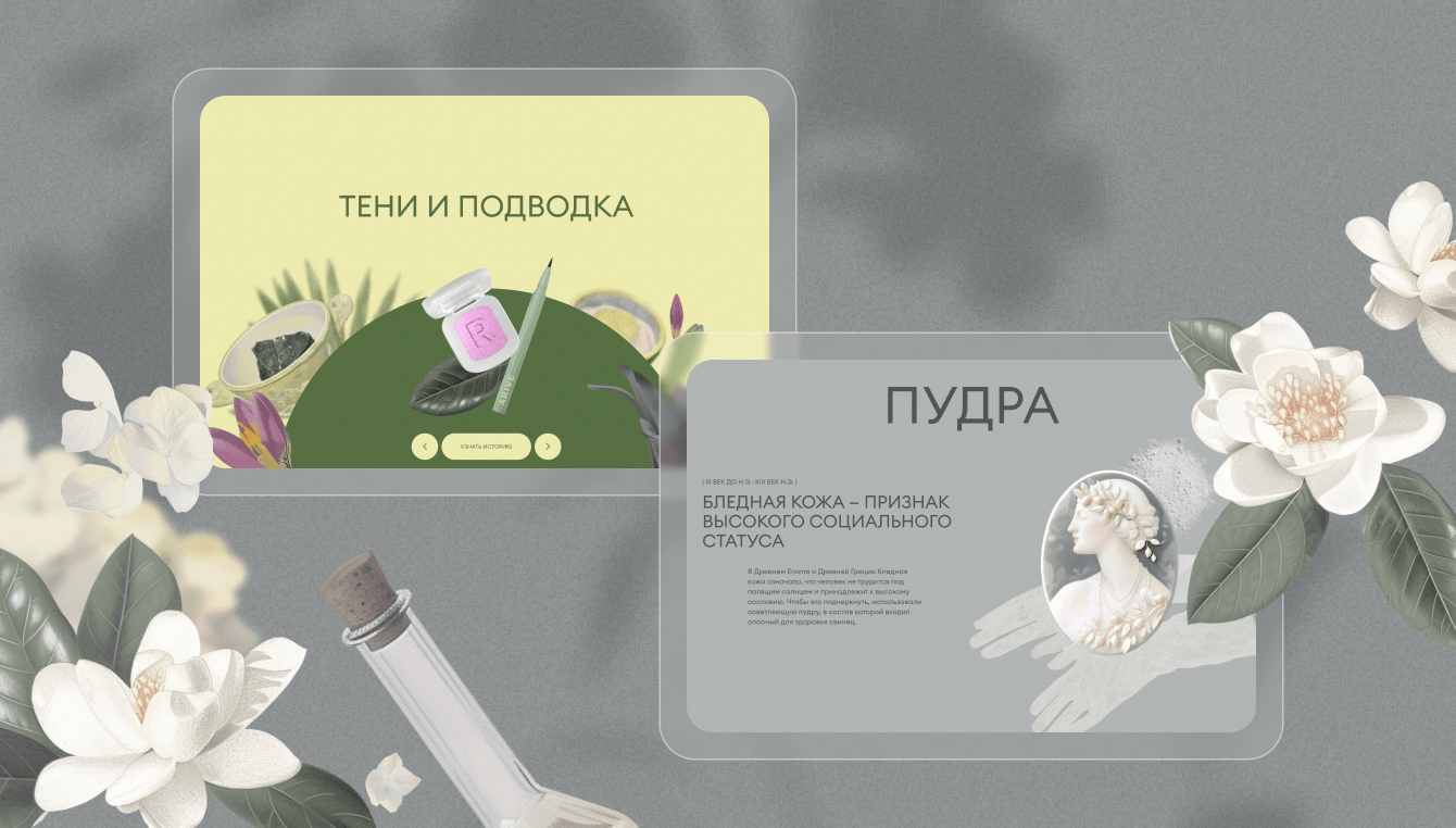 Взяли на себя создание контента: написали тексты совместно с экспертом по истории макияжа — она проверяла точность фактов и достоверность исторических иллюстраций.