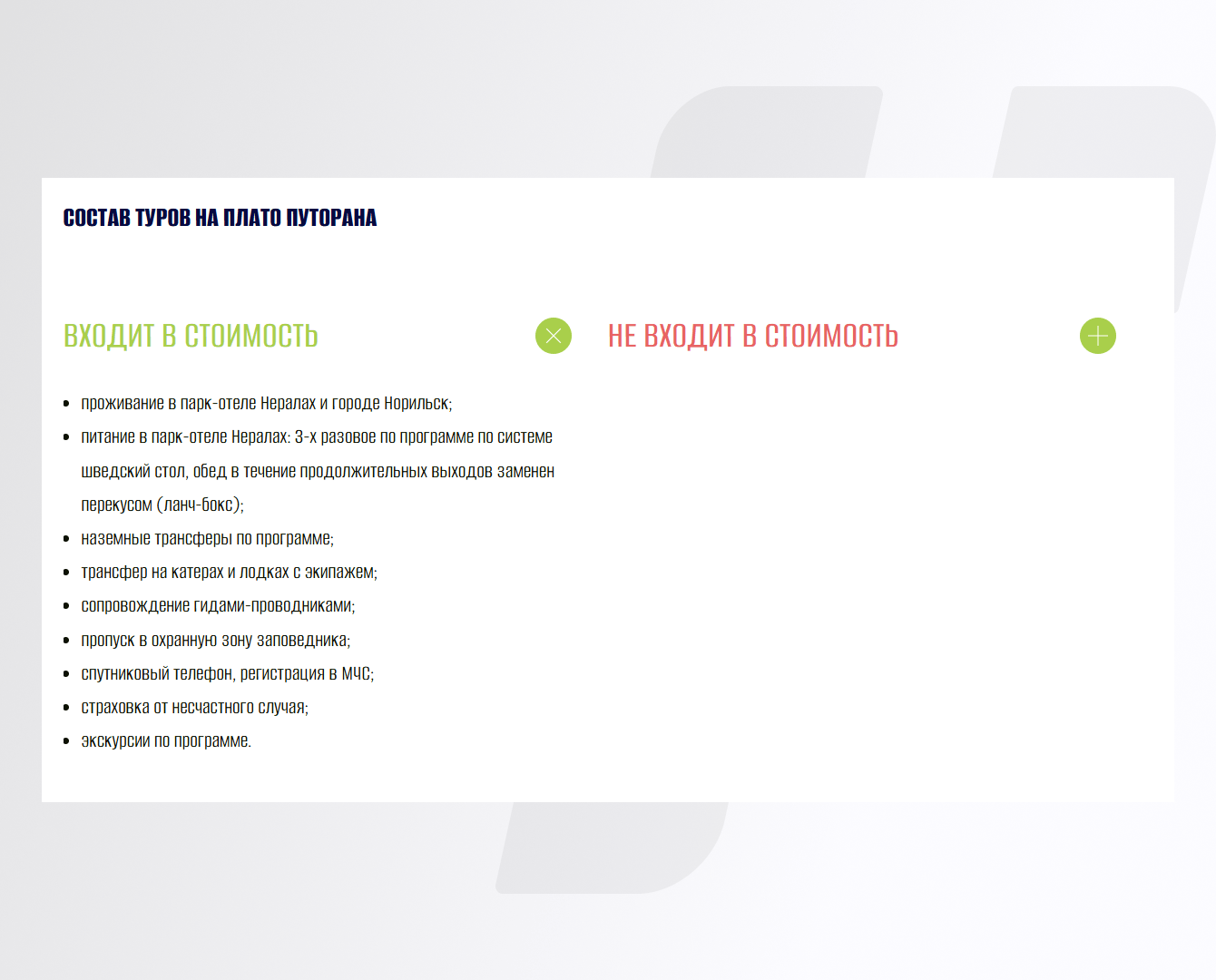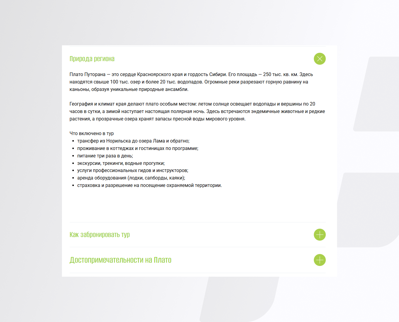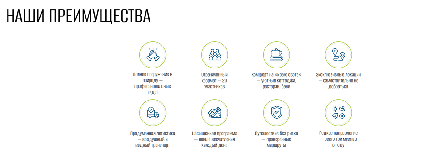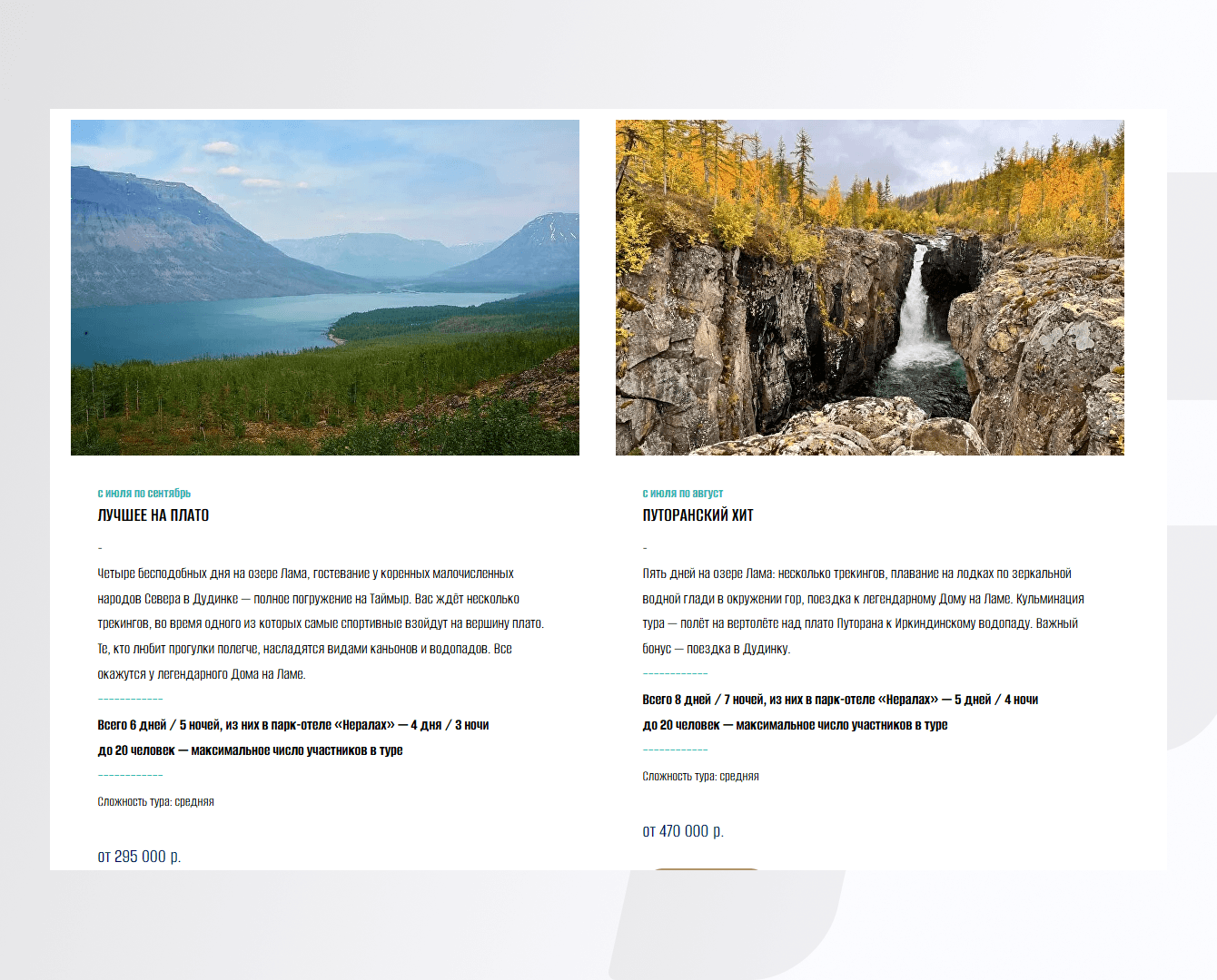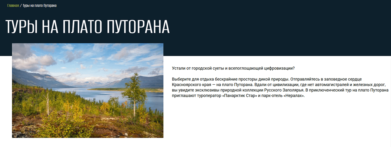 ➡️ География: например, «Туры на Плато Путорана», «Круизы из Владивостока».
