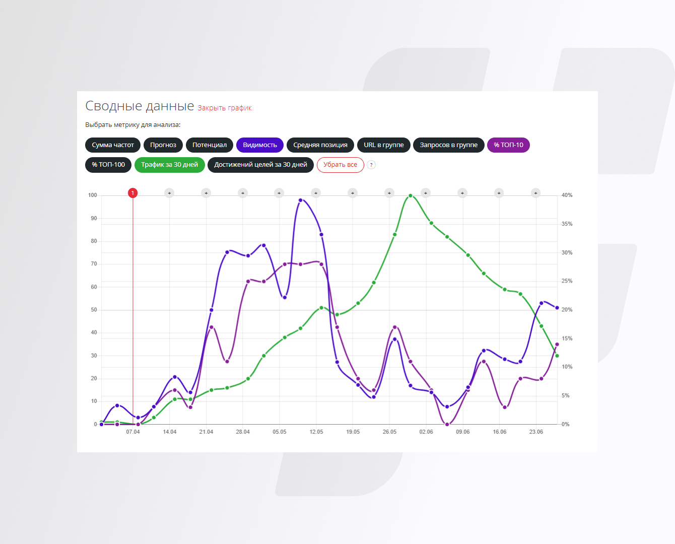 Всю аналитику мониторим в модуле ведения проектов «Пиксель Тулс» https://tools.pixelplus.ru/projects/ — комплексном сервисе, который отслеживает десятки параметров сайта. В кейсе использованы скриншоты в том числе из SEO-модуля.