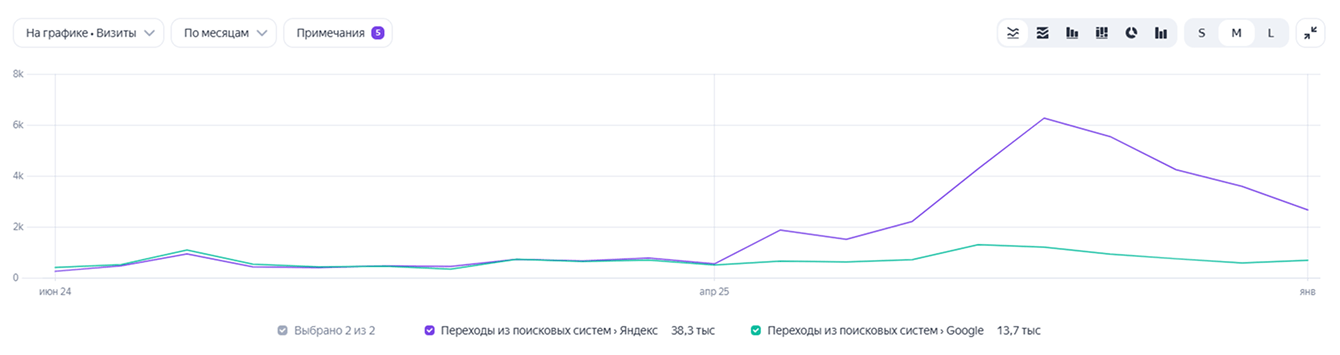 ✅ Яндекс: рост в 10 раз (с 254 до 2659 пользователей в месяц).