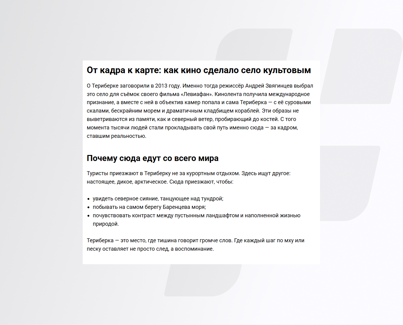 ☝️ Решение: Мы пошли в информационный трафик. Люди, готовые купить дорогой тур на Камчатку или Кольский, сначала долго изучают регион: «где находится полуостров Средний», «когда лучше ехать на Путорана».