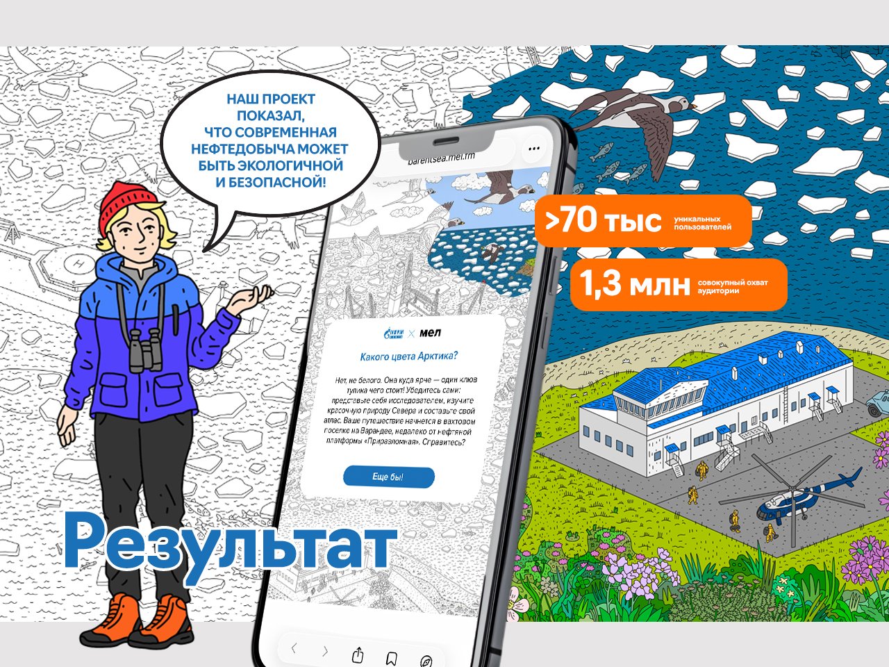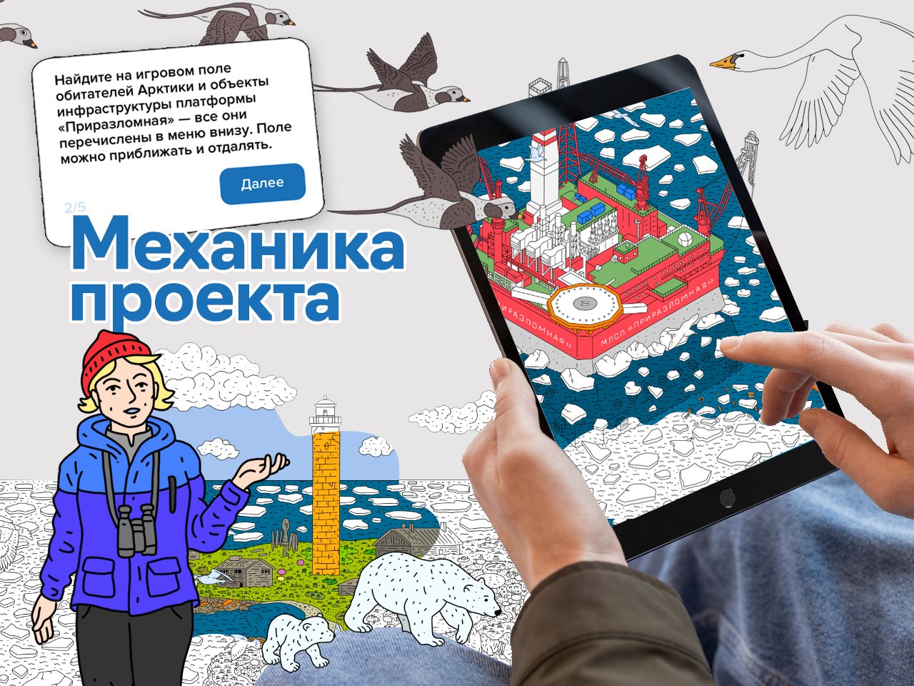 Вариативность игровых жанров проекта – поиск скрытых объектов, эффект «рентгена» и управляемый зум-эффект – позволили увеличить вовлеченность аудитории и интересно рассказать об особенностях региона и технологических решениях «Приразломной».