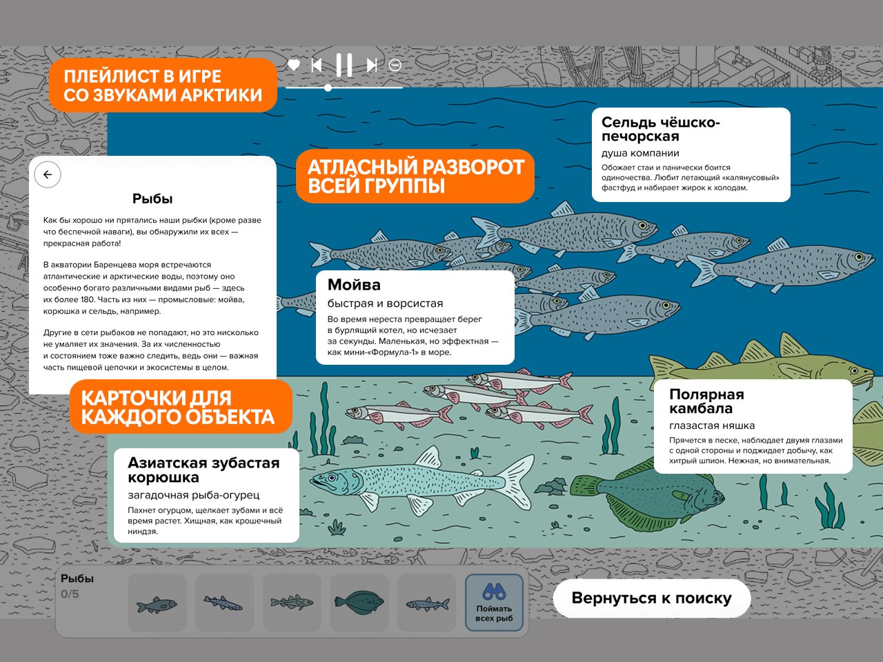 Поиск и постепенное наполнение атласа создает у пользователя ощущение «коллекционирования знаний» и дает дополнительную мотивацию к продолжению – сбору всей коллекции. А для полного погружения в Арктику игра сопровождается специальным плейлистом, где в треки интегрированы голоса арктических животных и звуки «Приразломной».