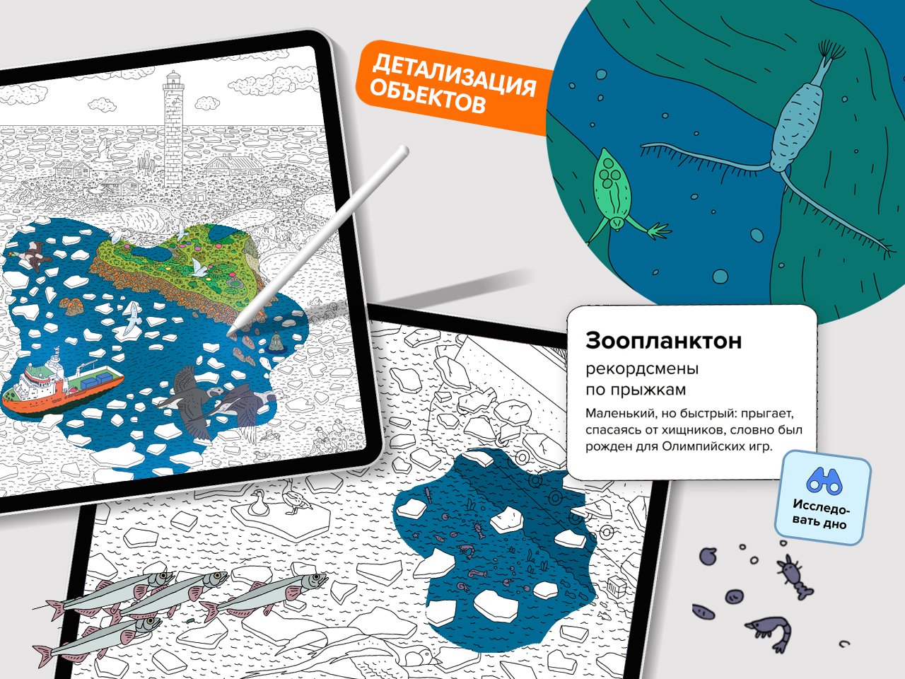 Пользователь путешествует по черно-белой карте, отыскивая необходимые объекты и раскрашивая карту разными цветами. Объекты разделены на 6 категорий: млекопитающие, птицы, рыбы, растения, гидробиологические сообщества и платформа «Приразломная».