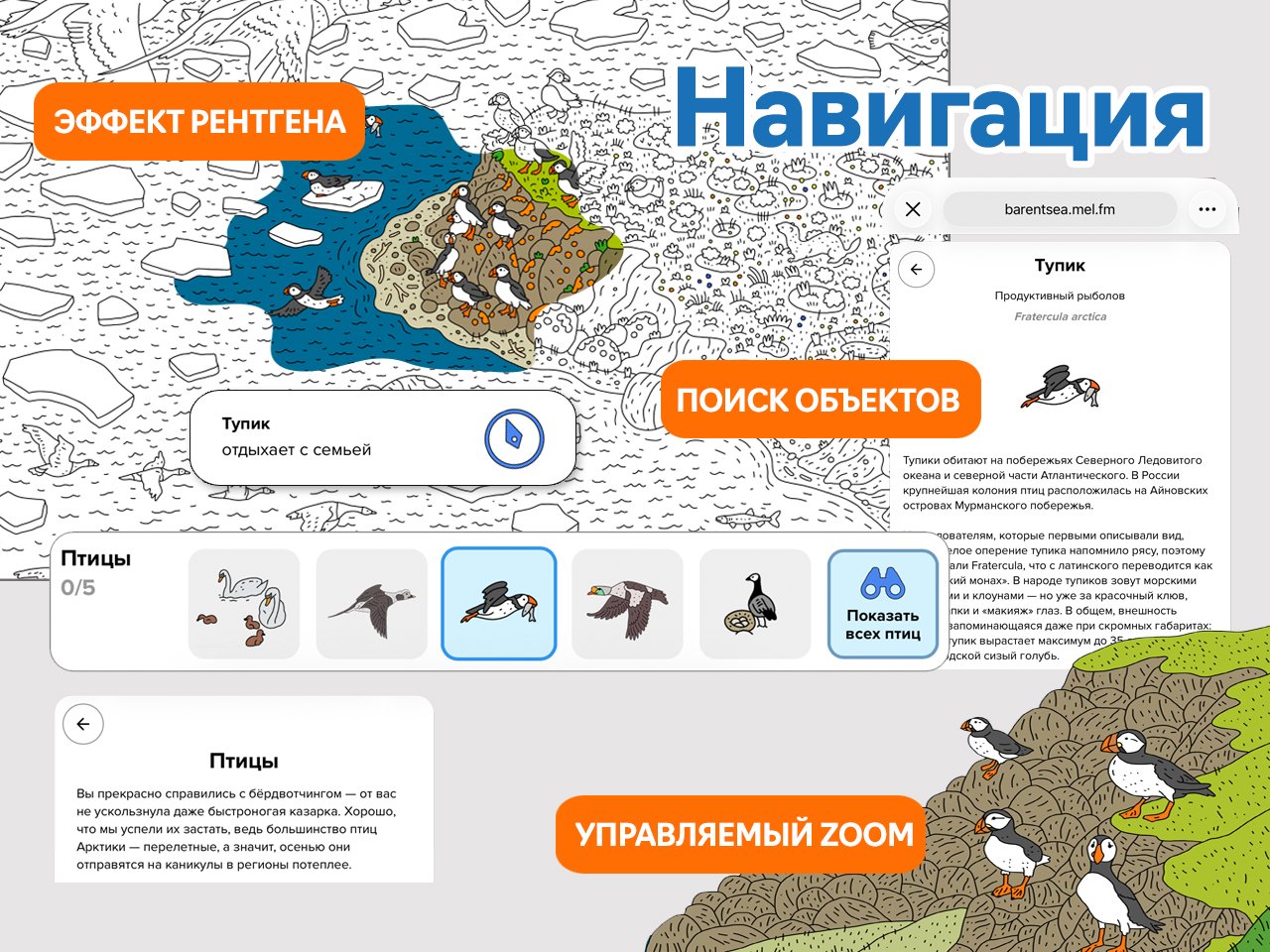 Атлас Баренцева моря представлен в изометрической, вертикальной проекции. Такой подход позволил нам не только показать обширные пространства акватории, но и благодаря трехмерности иллюстраций создать иллюзию глубины и объема, где объекты на суше, в воде и в воздухе отображены одновременно. Одной из главных задач в отрисовке проекта стала равномерная (а это 9 экранов!) заполненность карты. С ней отлично справился художник проекта – Александр Блосяк, работающий в стиле mural art.