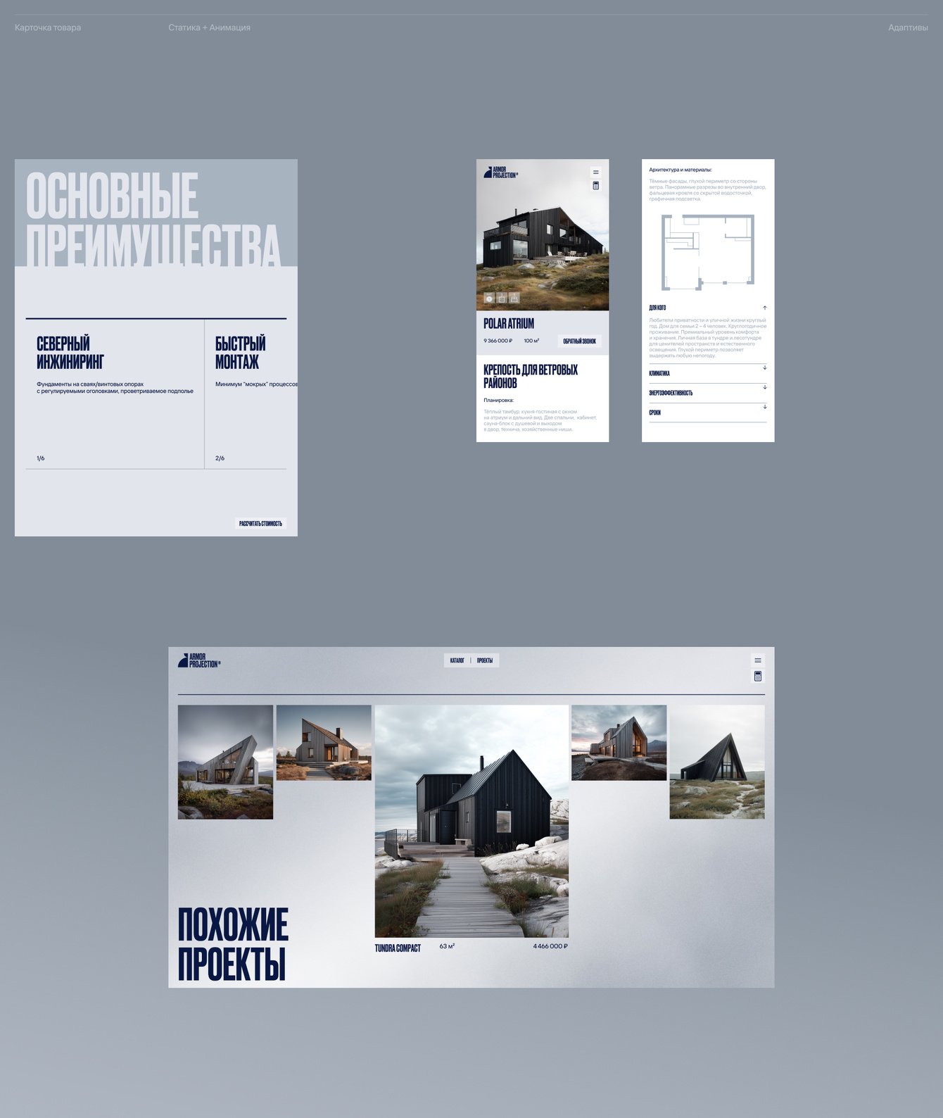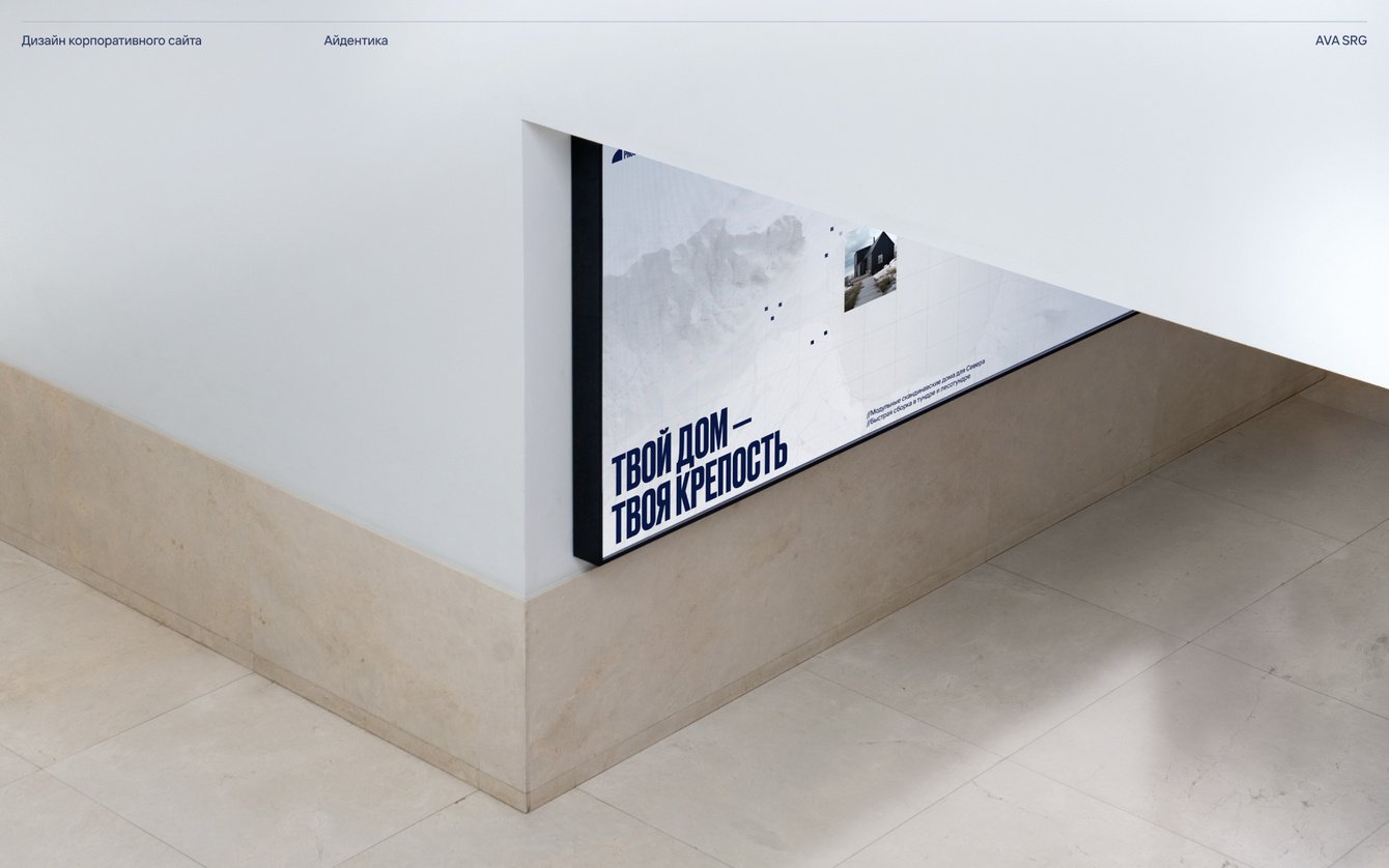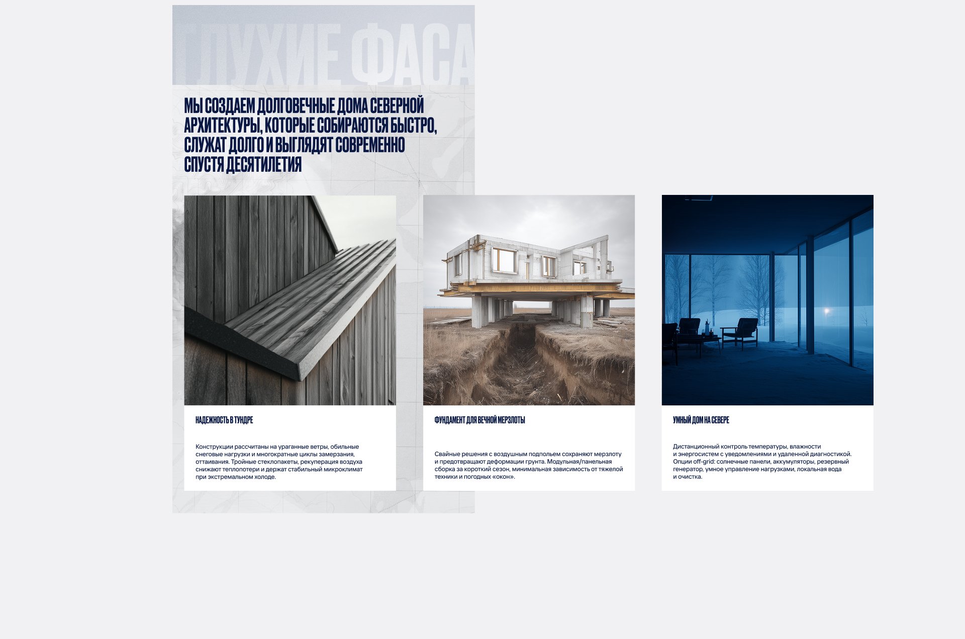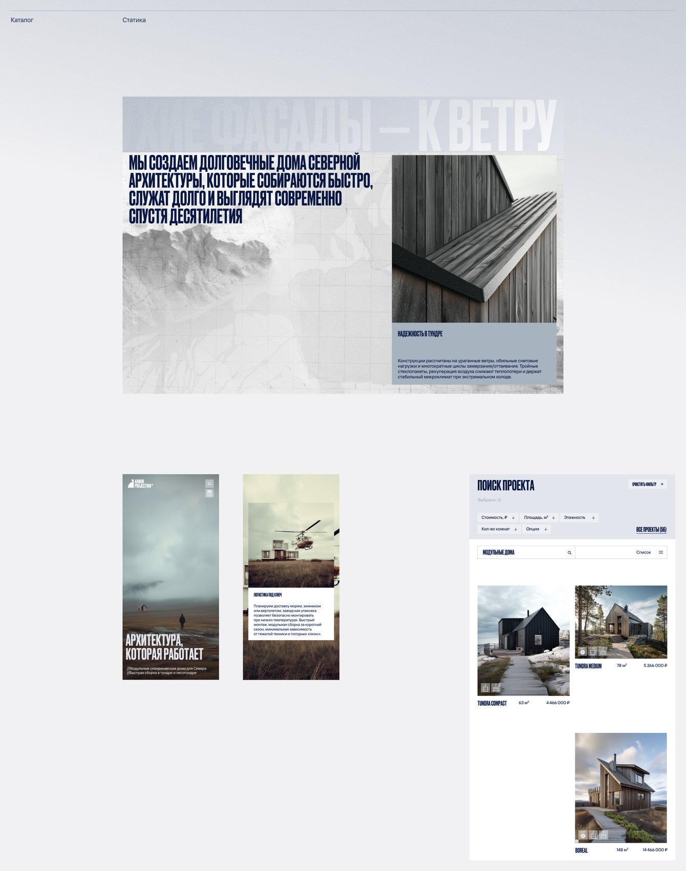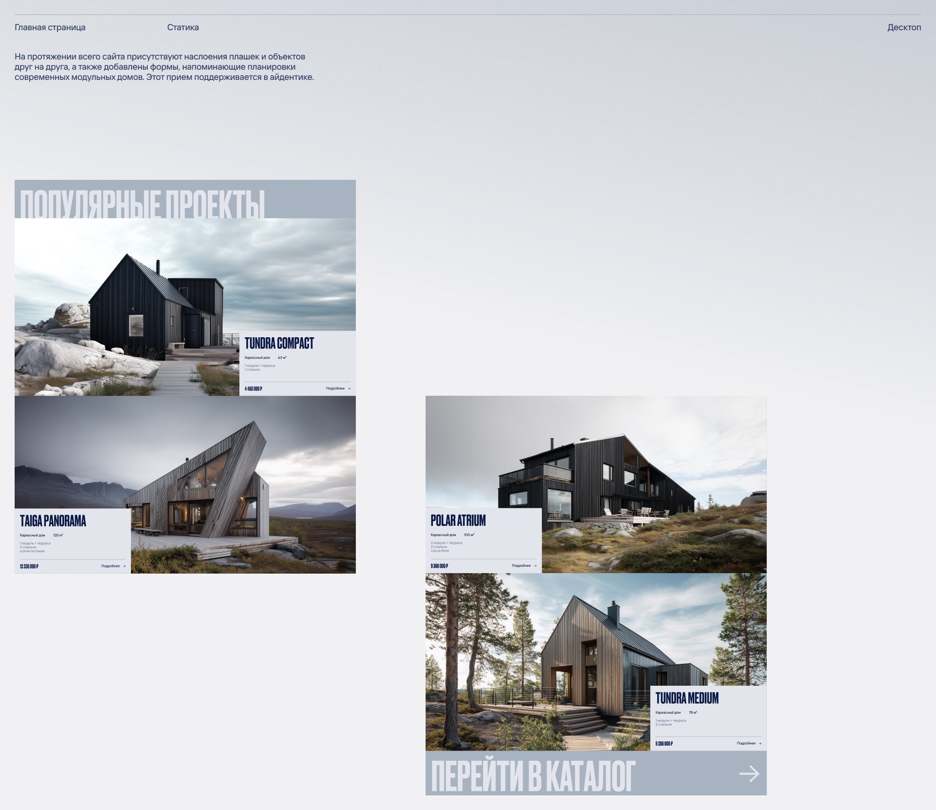 На протяжении всего сайта присутствуют наслоения плашек и объектов друг на друга, а также добавлены формы, напоминающие планировки современных модульных домов. Этот прием поддерживается в айдентике.