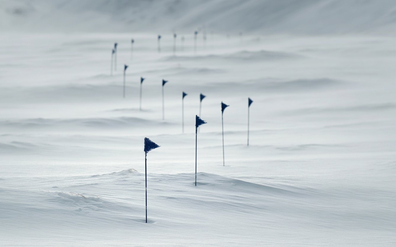 На главном экране присутствует интерактивное взаимодействие. Изображена карта с топологией местности, на которой точками отмечены уже построенные компанией дома. Для придания атмосферы, передающей суровый холодный климат, анимирован туман.