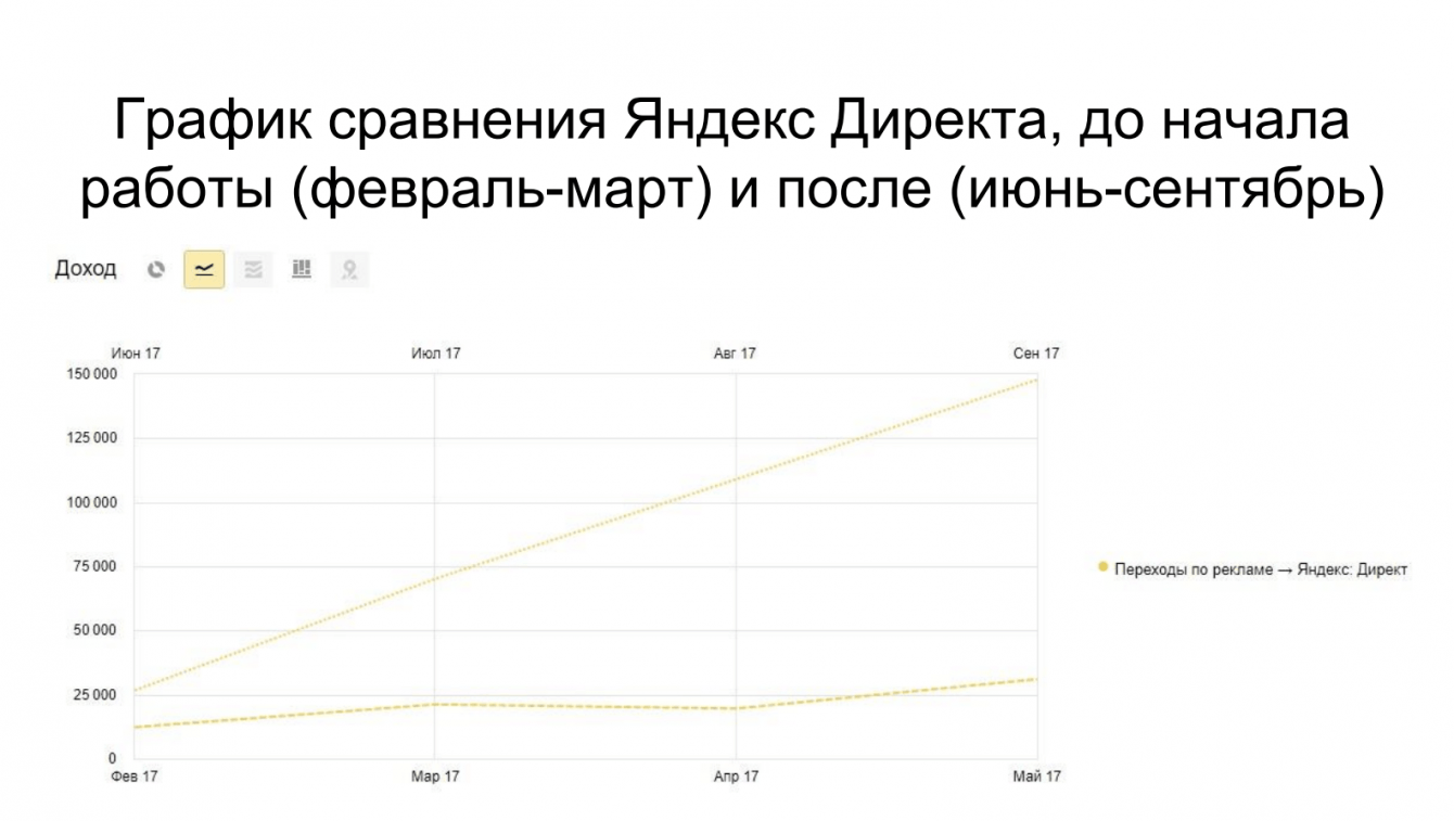 График сравнения Яндекс Директа, до начала работы (февраль-март) и после (июнь-сентябрь):