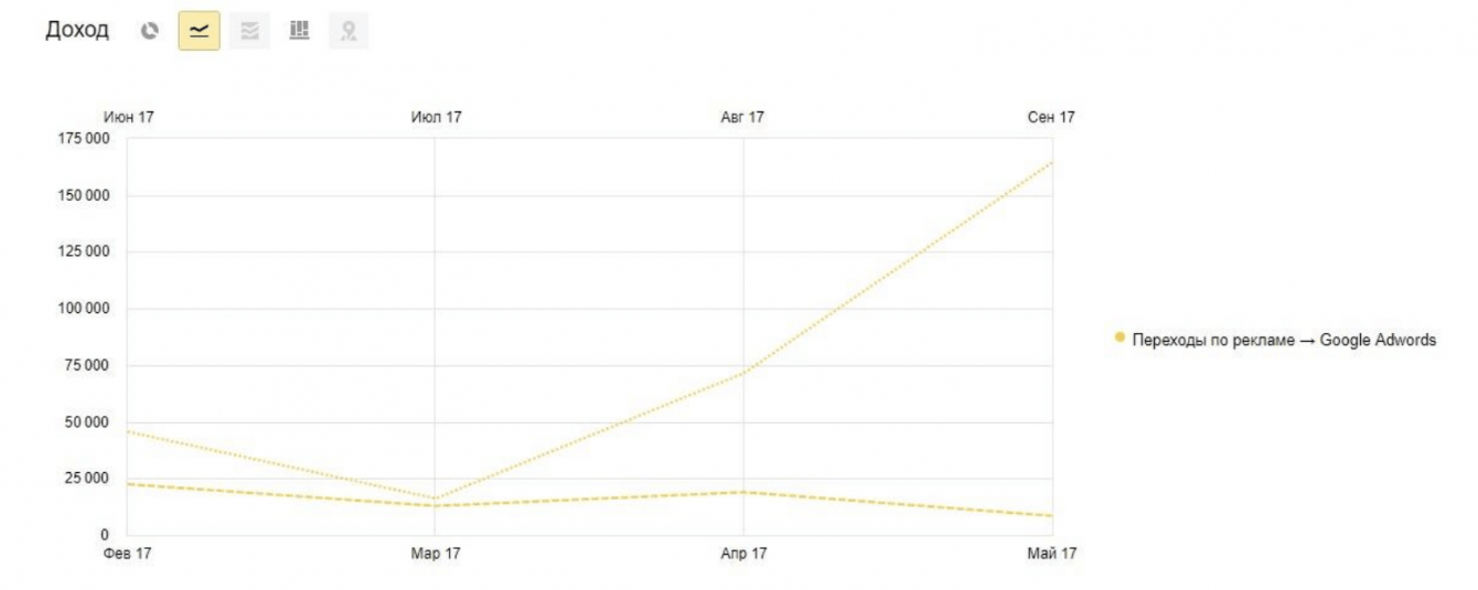 График сравнения Google Adwords, до начала работы (февраль-март) и после (июнь-сентябрь):