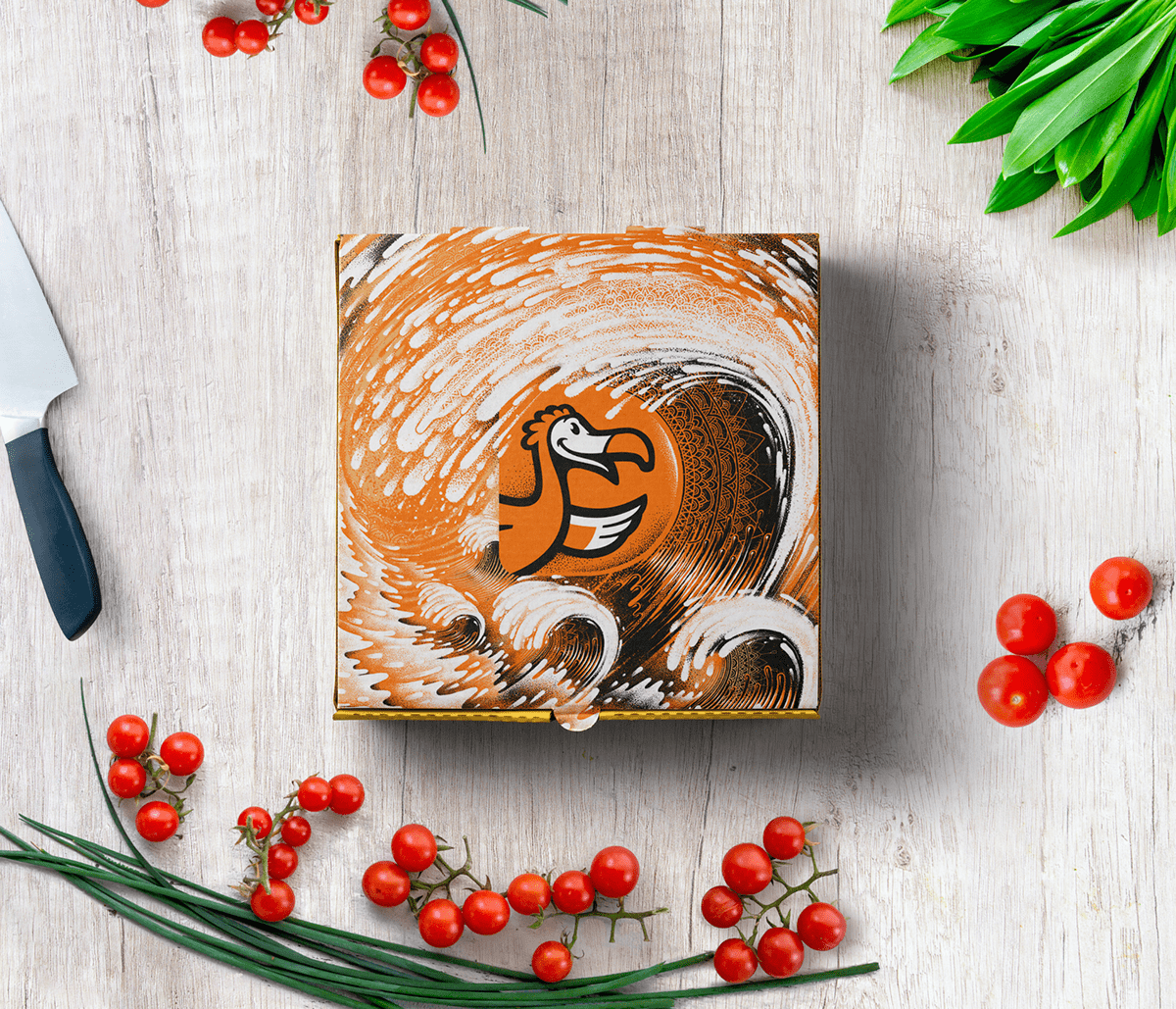 Разработать уникальный стиль иллюстрации для упаковки пиццы на доставку.