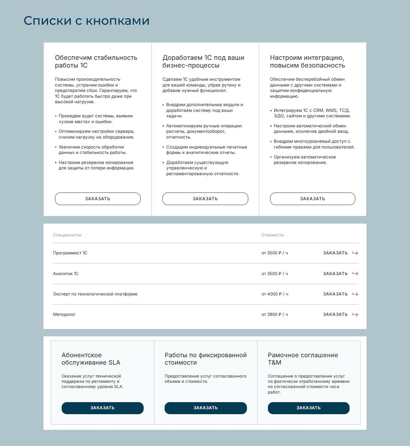 В ходе анализа конкурентов, обсуждений с клиентом и SEO-проектирования выяснилось, что наполнение отдельных разделов пока не определено: было неясно, какие блоки использовать и в каком порядке их размещать. Сайты конкурентов демонстрировали разные подходы, а у заказчика на старте не хватало контента для всех страниц.