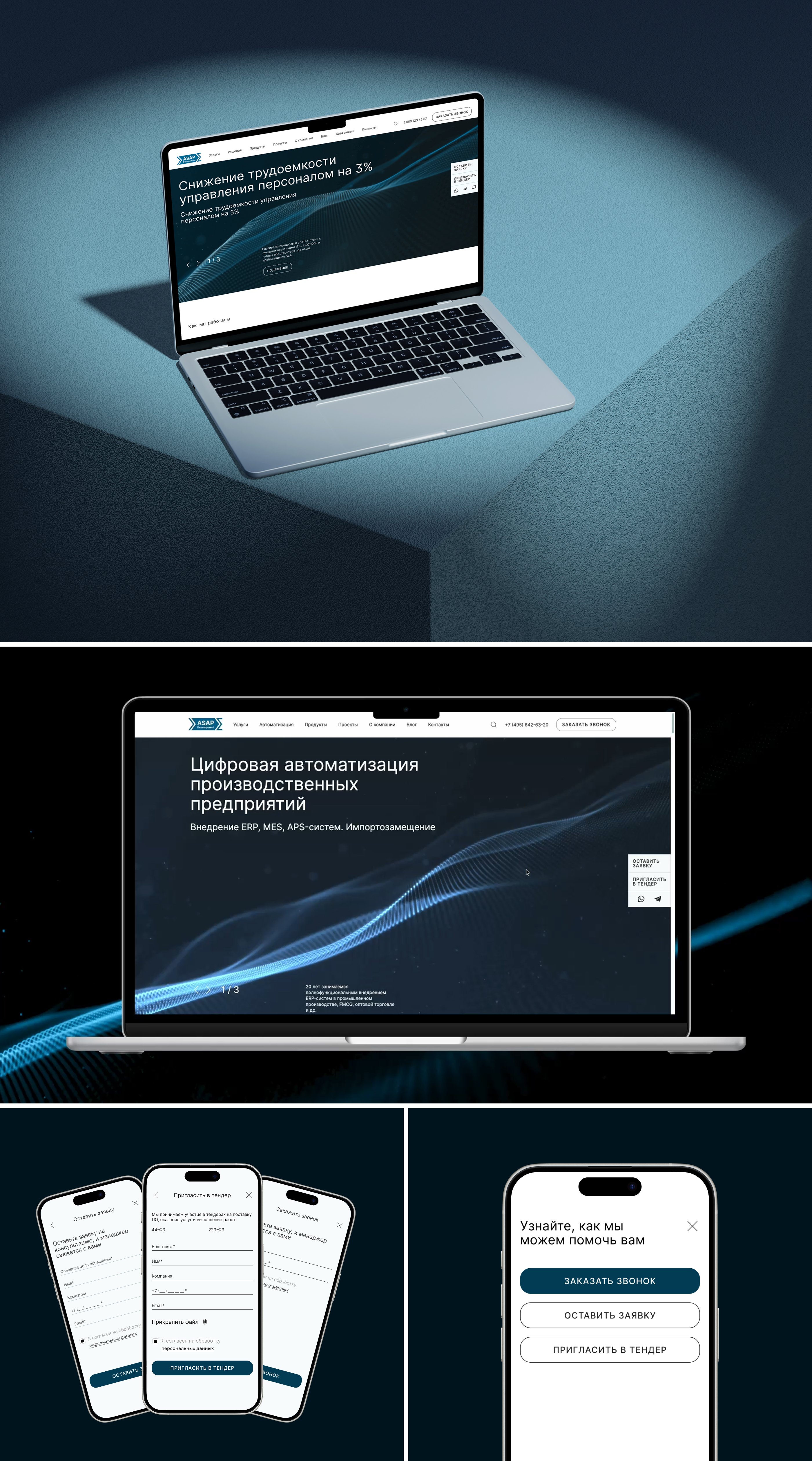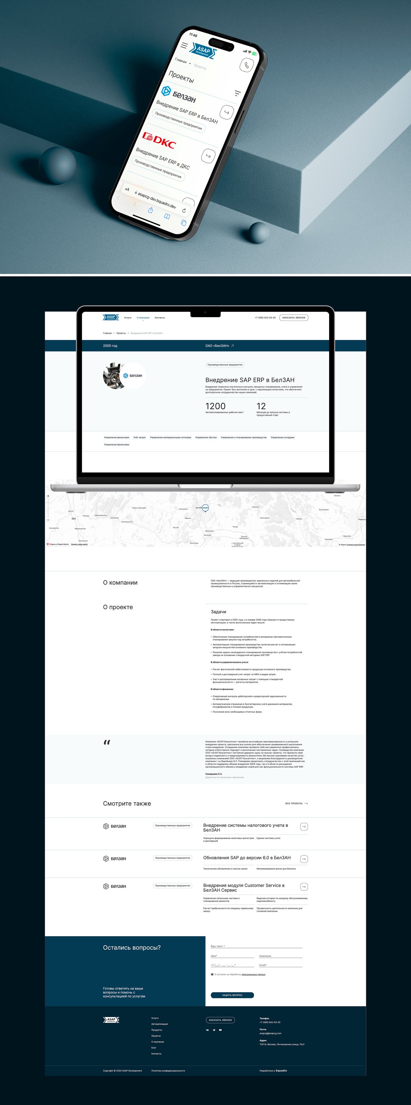 Дизайн и архитектура сайта направлены на систематизацию услуг, наглядную демонстрацию кейсов и формирование образа «АСАП Разработка» как опытного технологичного IT-подрядчика.