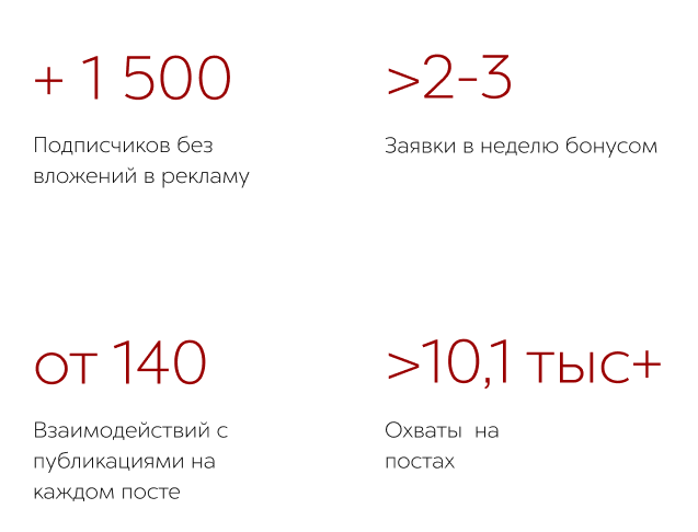 Благодаря проработанным хештегам и контенту, каждый второй пост попадал в раздел «Интересное» в Instagram. Каждый пост набирал охвата от 2 тыс. — из них бесплатный охват 80%. Максимальный охват постов достигал до >10 тыс.