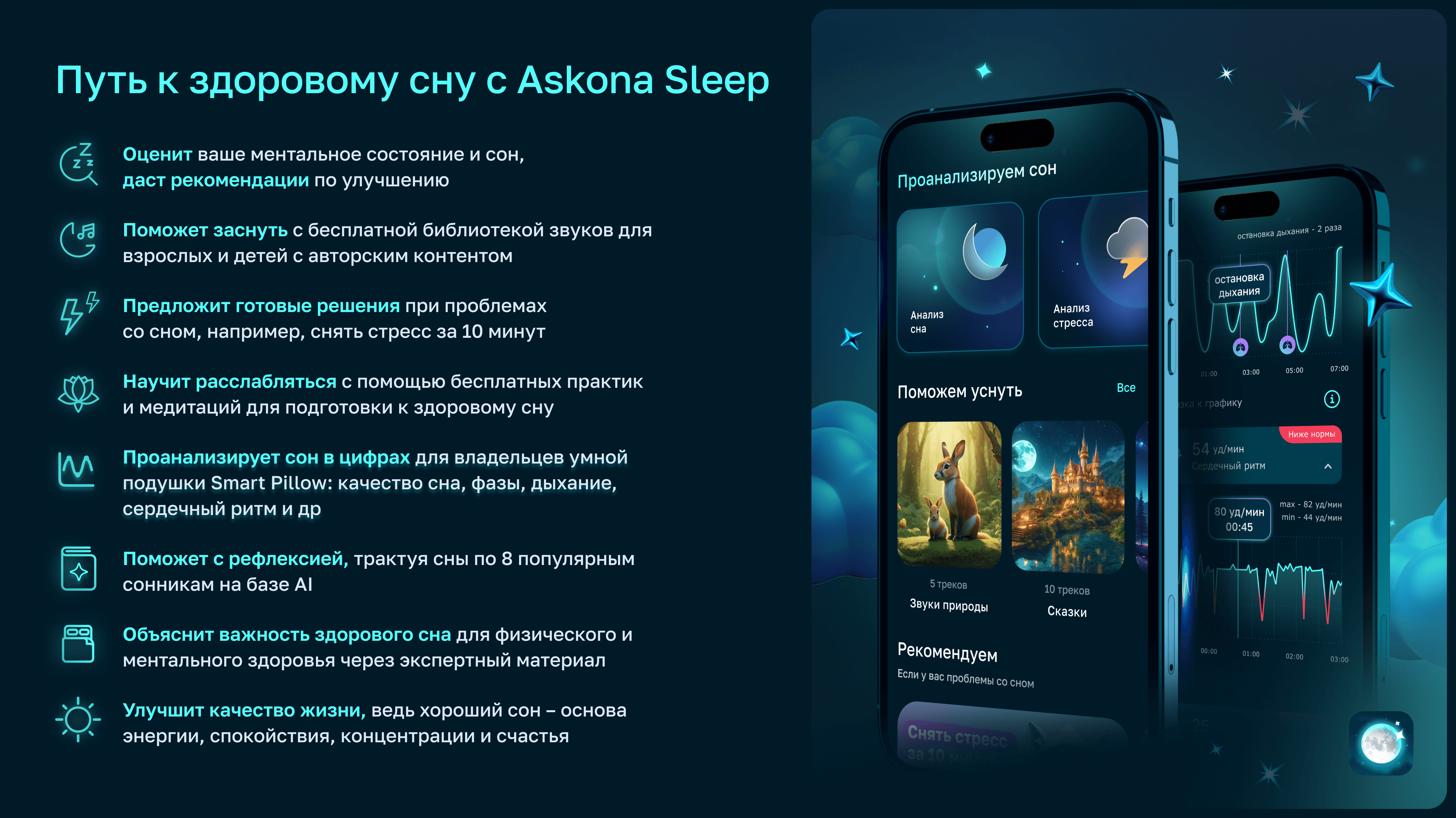 Askona Sleep — это не просто приложение, а экосистема заботы о сне и жизни. Проект демонстрирует, как технологии, медицина и ИИ могут работать вместе ради улучшения качества жизни миллионов людей.