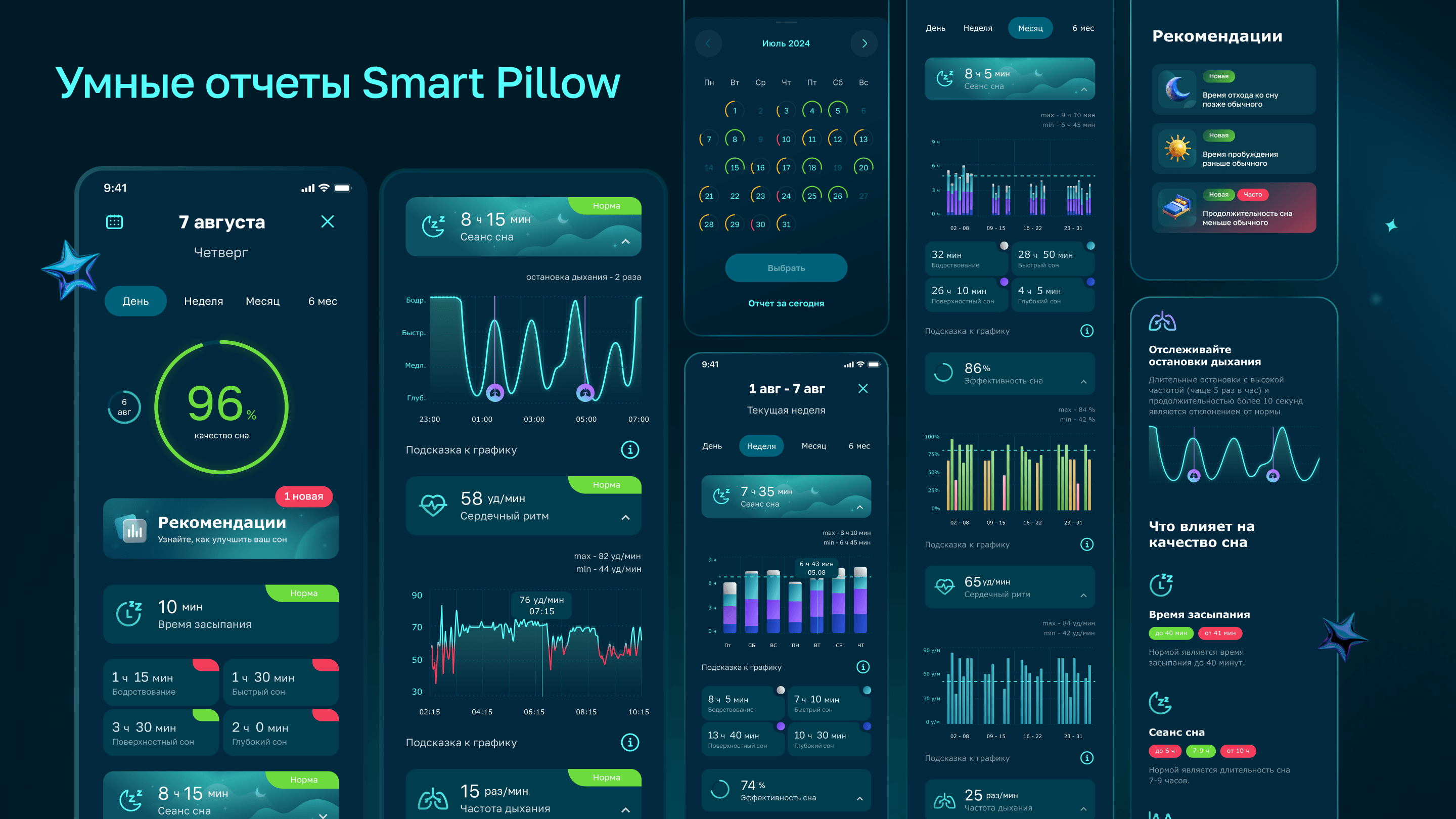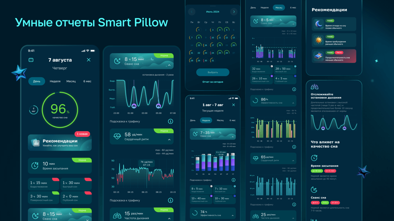 Реализовали ряд новых функций, направленных на предоставление пользователям более полной и точной информации о качестве их сна. При подключении умной подушки пользователь получает: