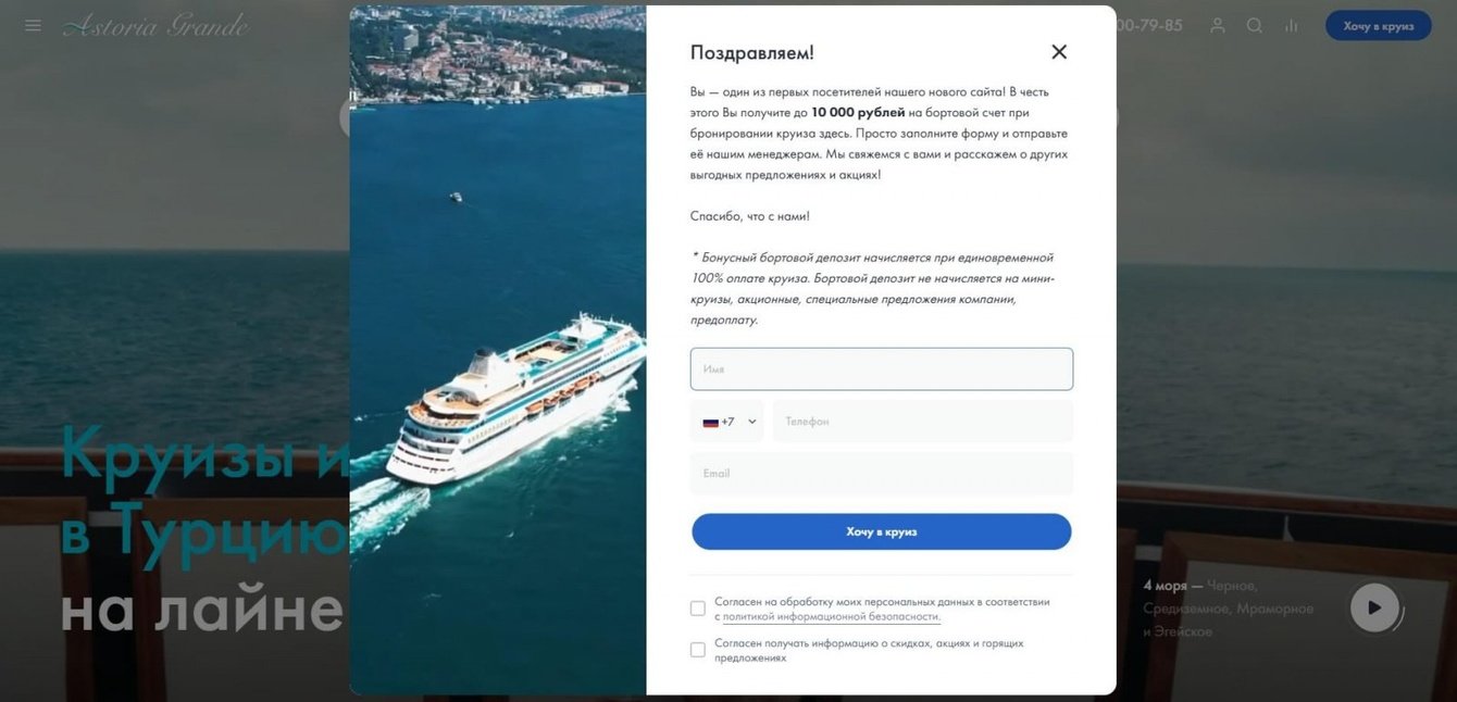 Первым решением для повышения конверсии стало внедрение всплывающей формы. Мы разработали аккуратный и ненавязчивый баннер, который появляется спустя несколько секунд после захода на сайт. Этот шаг дал ощутимый результат: количество лидов выросло, поэтому было решено усилить этот подход. Мы провели анализ зарубежных сайтов круизных компаний, где активно используются баннерные механики, расширили набор баннеров и промоблоков, сделав их не только визуально привлекательными, но и максимально эффективными.