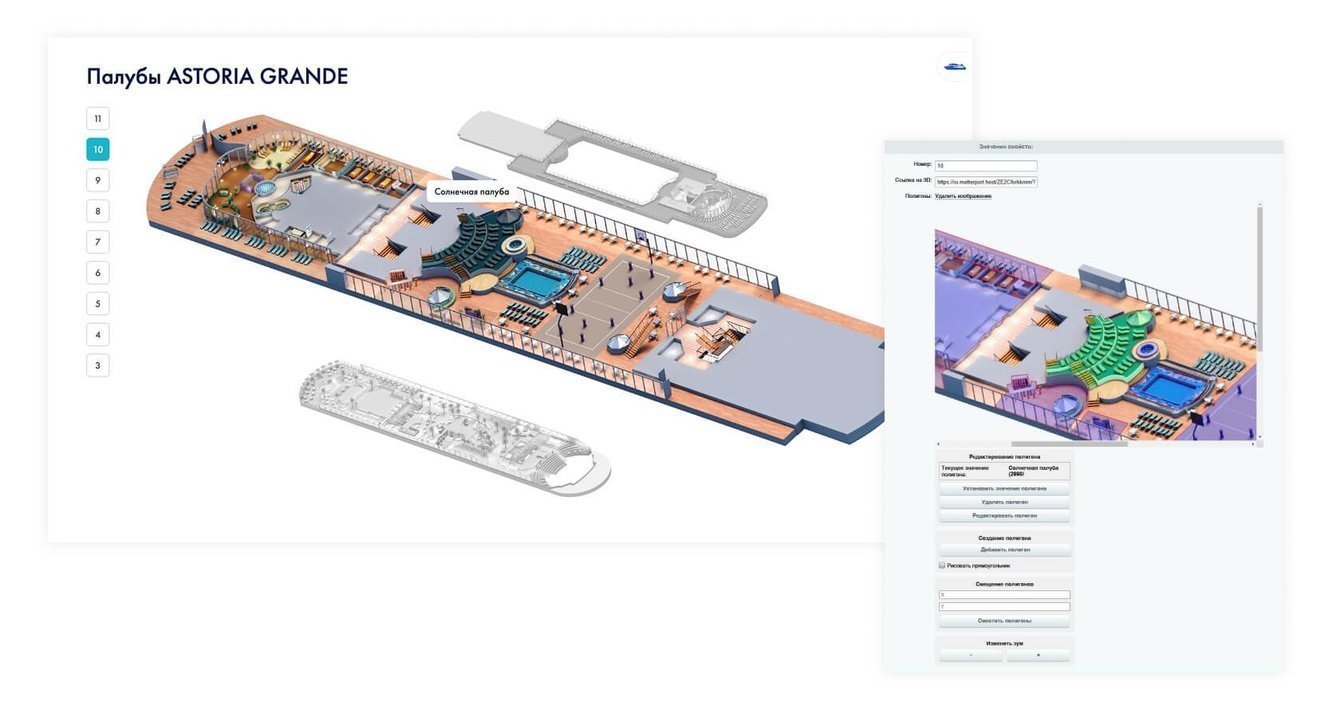 Например, на одной из палуб есть бассейн. Его можно выделить в административной панели и задать подпись, описание и даже дать ссылку на 3D-тур. Этим функционалом мы убили сразу двух зайцев — ещё он используется на странице бронирования для ручного выбора кают.