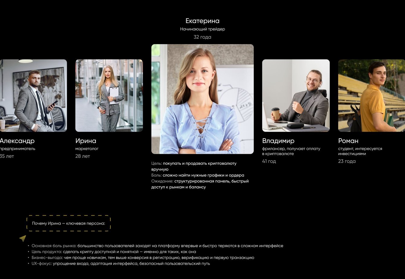 Мы выделили 5 ключевых типов пользователей платформы — от новичков до опытных трейдеров. Это позволило точнее понять потребности аудитории и сосредоточиться на простом входе, понятной навигации и безопасных финансовых операциях. Каждая персона отражала сценарии использования, боли и ожидания, что стало основой для проектирования UX.