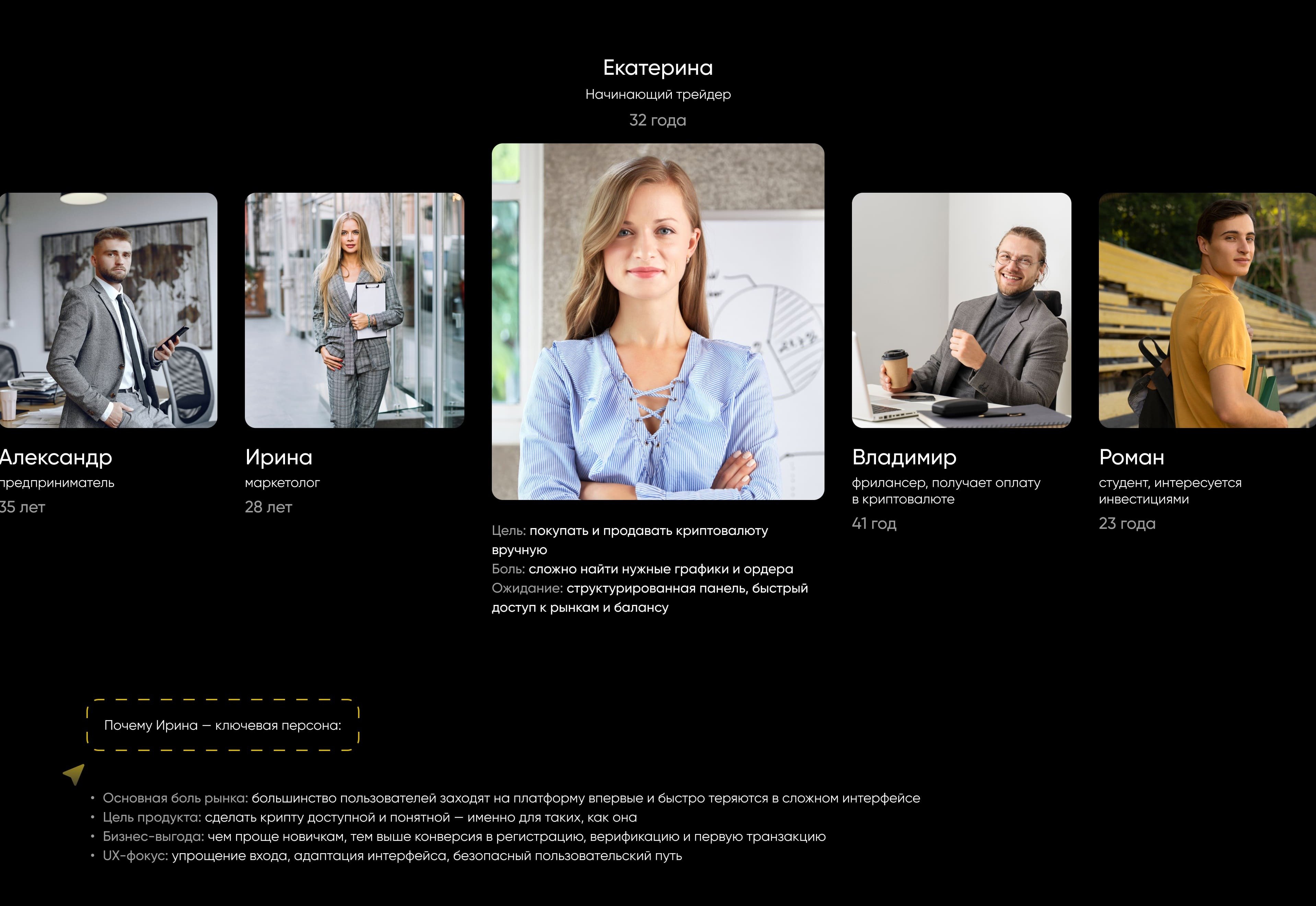 Мы выделили 5 ключевых типов пользователей платформы — от новичков до опытных трейдеров. Это позволило точнее понять потребности аудитории и сосредоточиться на простом входе, понятной навигации и безопасных финансовых операциях. Каждая персона отражала сценарии использования, боли и ожидания, что стало основой для проектирования UX.