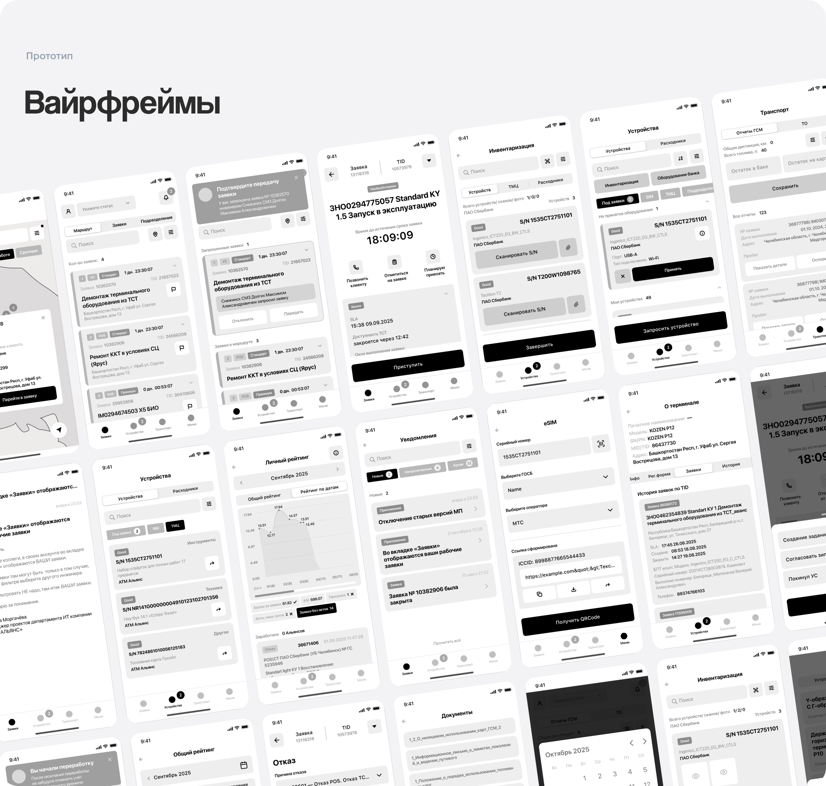 4. Связали экраны в интерактивный прототип для проверки логики основных сценариев: поиск заявки, работа с маршрутом, заполнение отчетов и закрытие заявки.