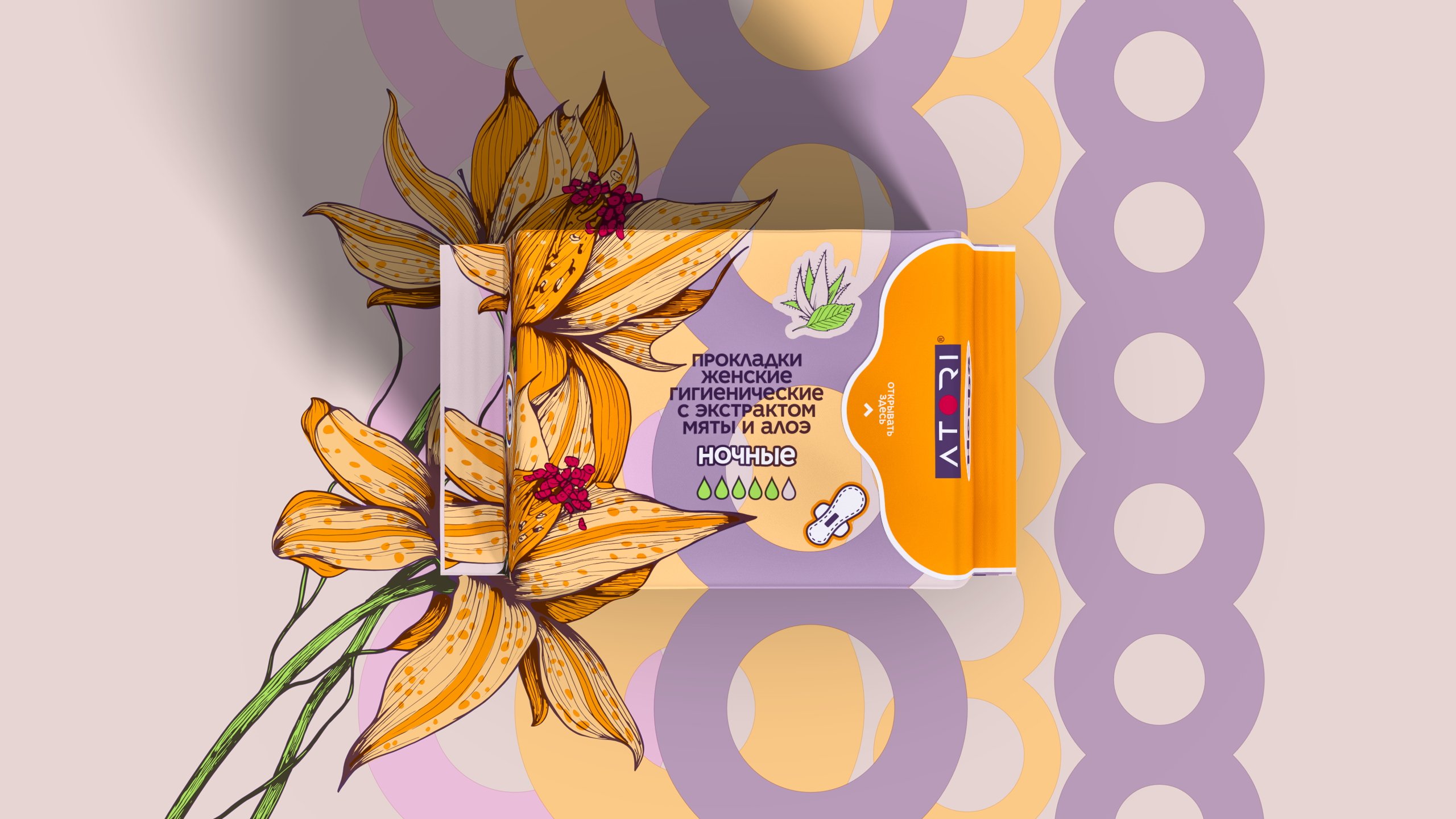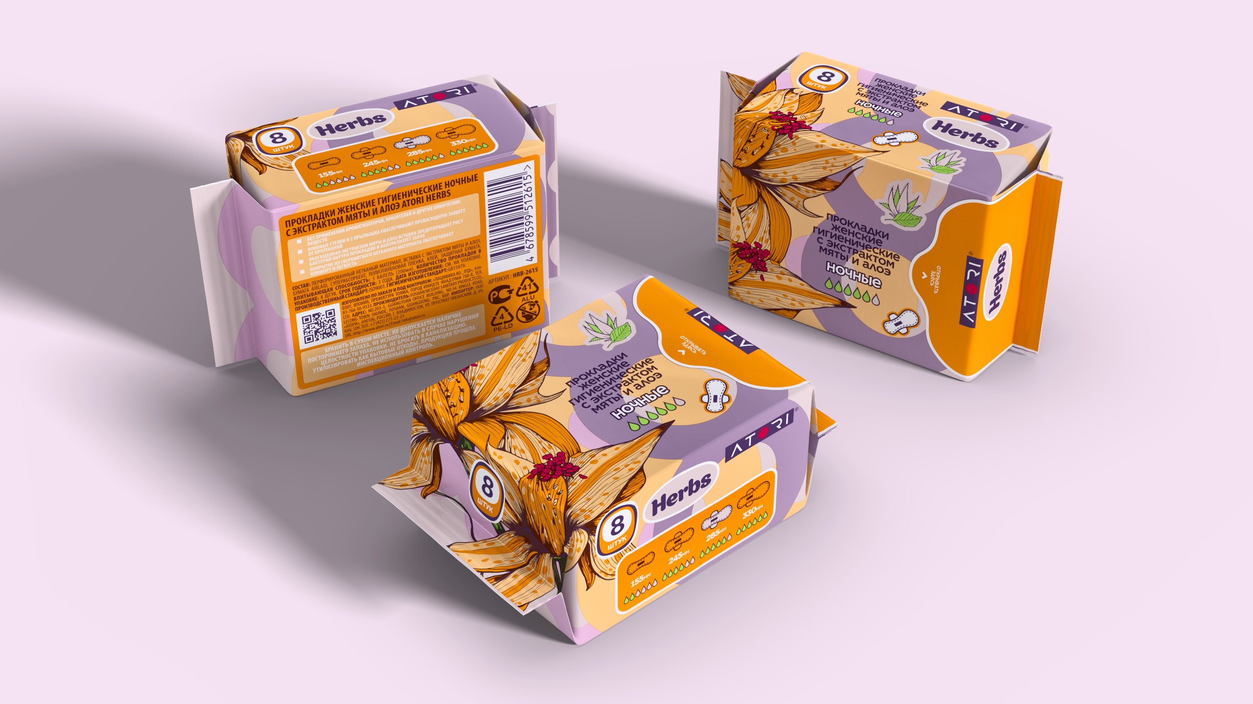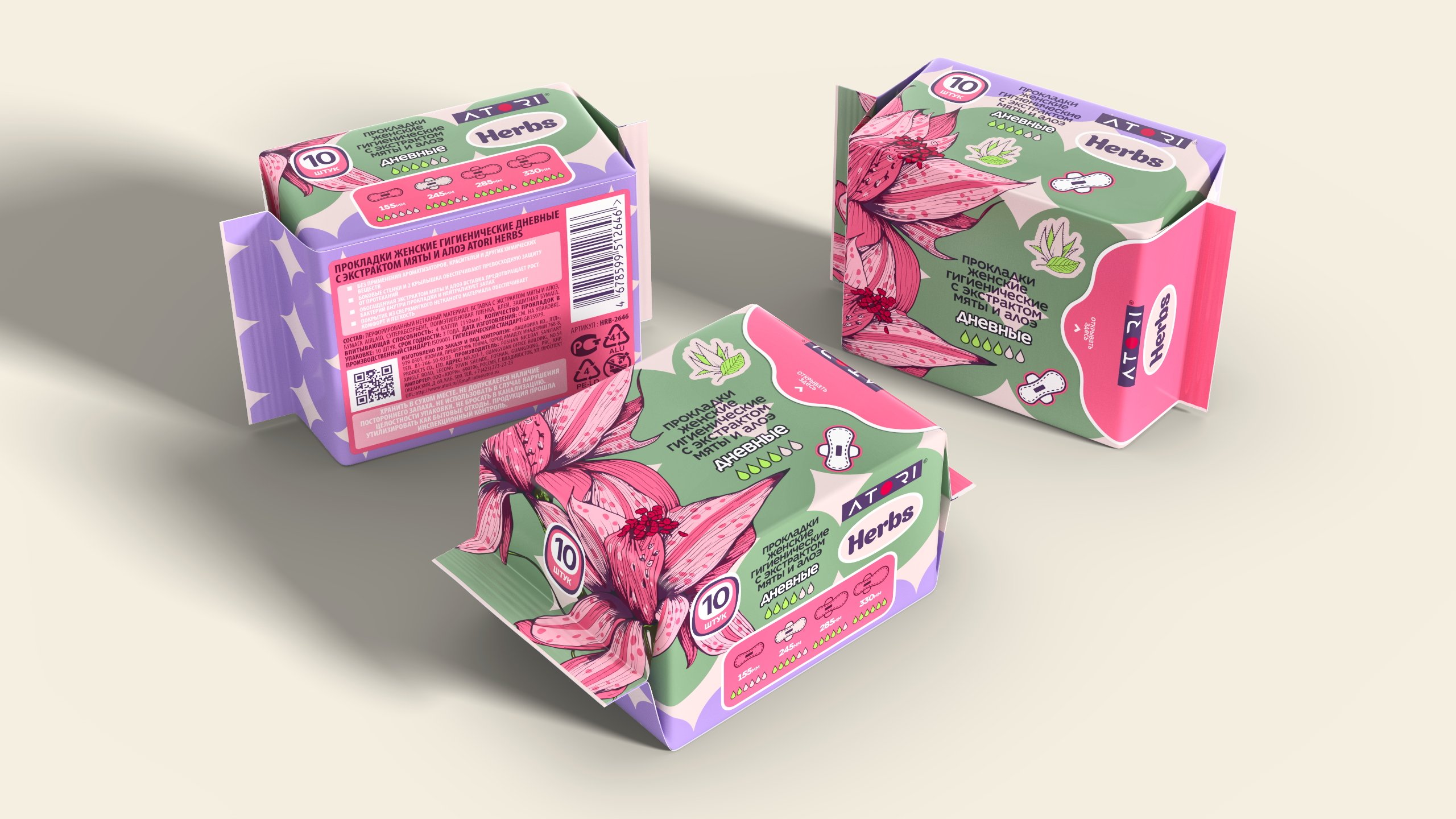 Задача, которую поставил заказчик, бренд ATORI — создать узнаваемую торговую марку средств женской гигиены и упаковку для женских гигиенических прокладок ATORI Herbs из натуральных материалов, обогащенные травами, которые обеспечивают дополнительную защиту и уход, воплотив в себе заботу природы и современные технологии.