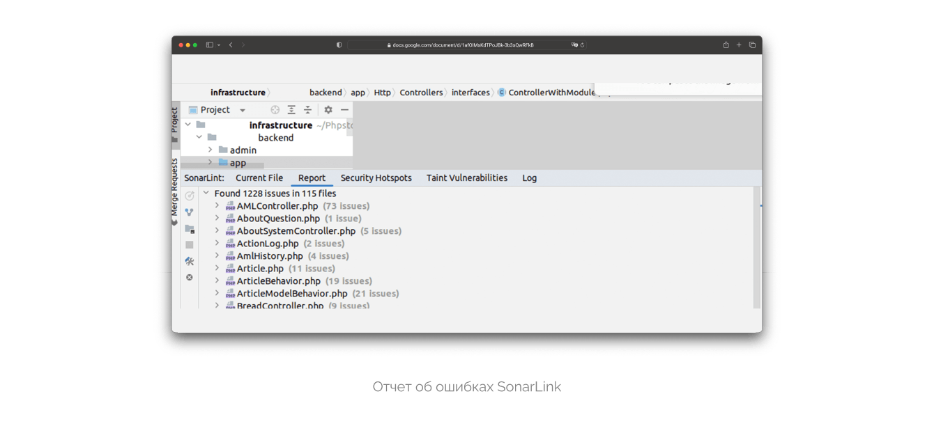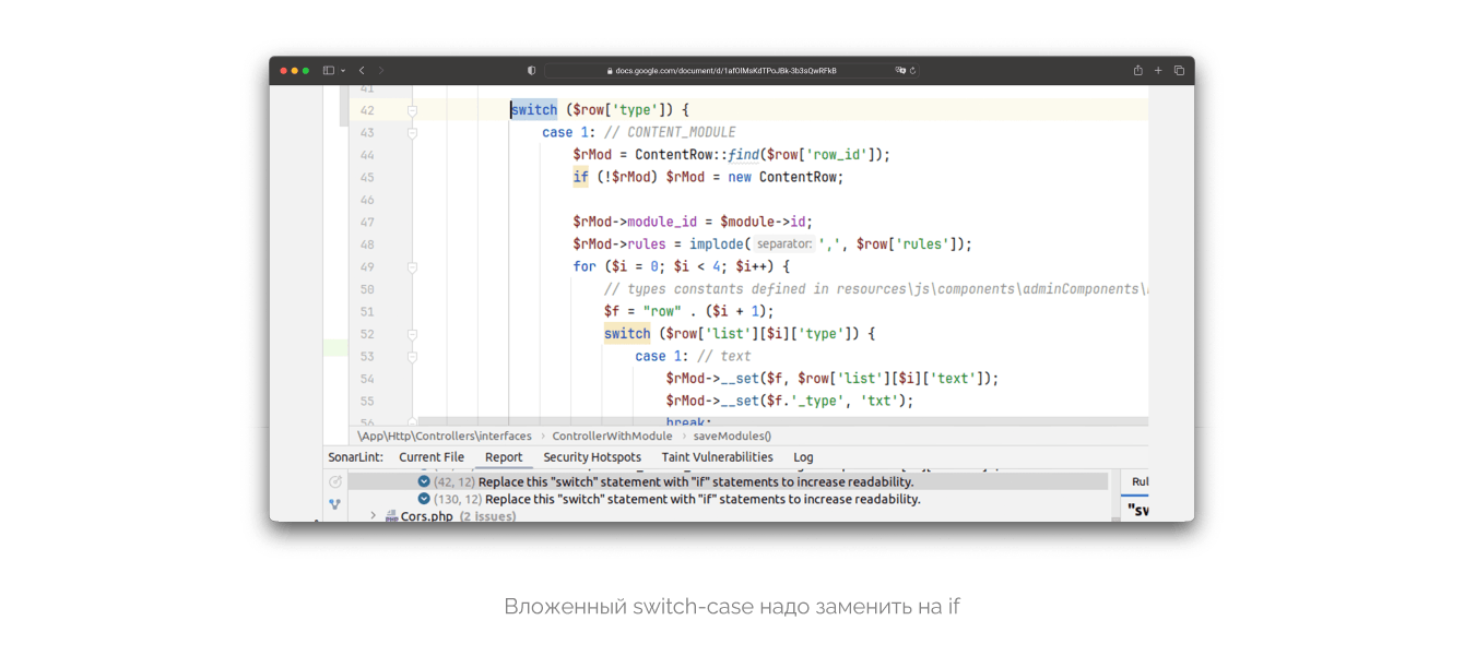 Статический анализатор SonarLink выявил в коде порядка тысячи ошибок – в основном code smells вроде смешения стилей именования переменных, вложенных switch-case, отсутствия действия по умолчанию в switch-case и приведений типов в стиле JS․ Это непринципиальные ошибки, но от них лучше избавиться или заглушить, а также прогнать весь код через автоформатирование по стандарту PSR, потому что пустой отчет об ошибках поможет быстрее выявлять проблемы при будущих доработках.