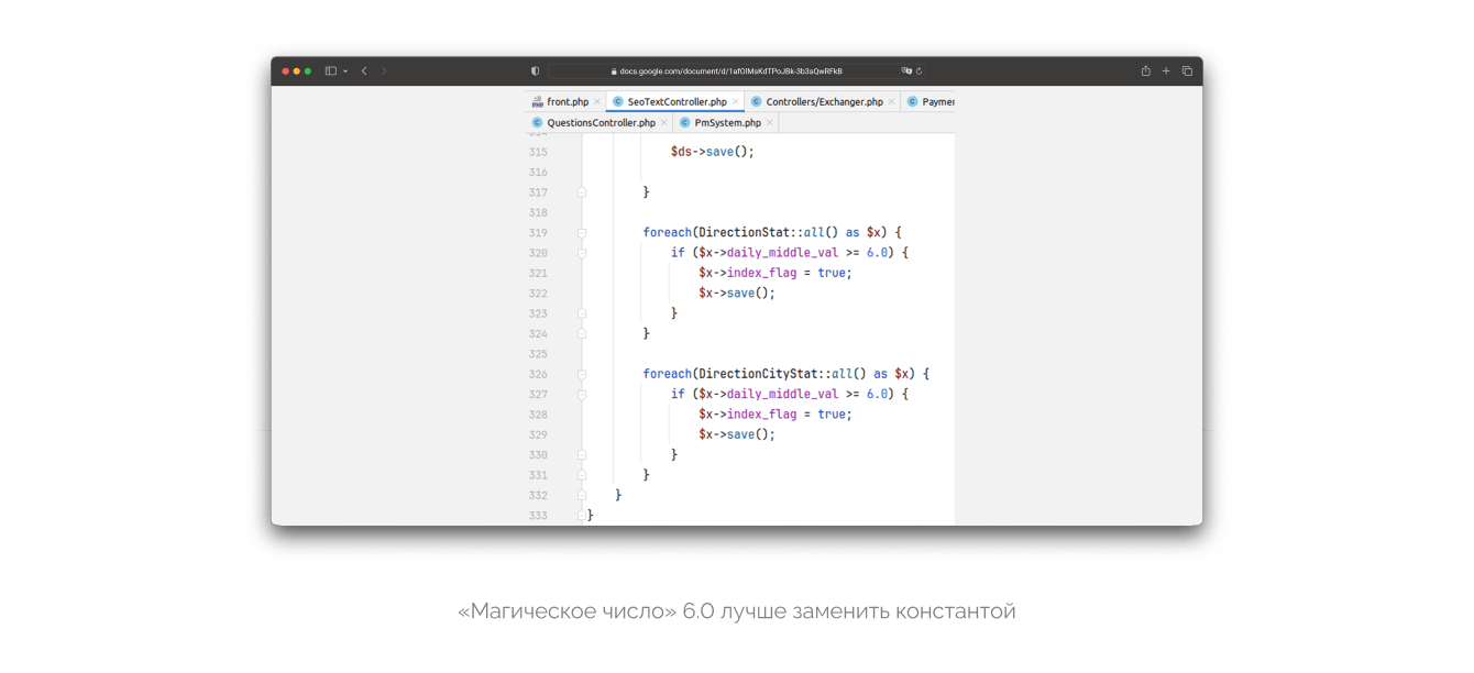 Мы предложили избавиться от «магических чисел» внутри кода, заменив их на константы, вынести кэширование в отдельный метод (чтобы можно было при необходимости выбирать кэшированный или прямой результат), разбить большие методы для лучшей читаемости. Кроме того, стоит использовать кэш, чтобы не подсчитывать при каждом запросе количество элементов (на Postgre это ресурсоемкий процесс), а также не выдавать подробности ошибок через $e->getMessage даже в интерфейсе администратора.