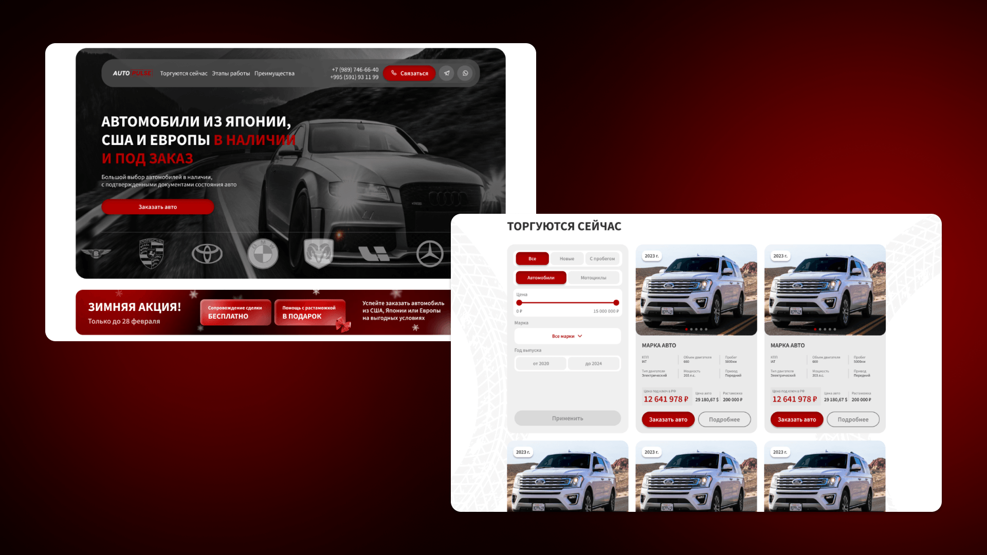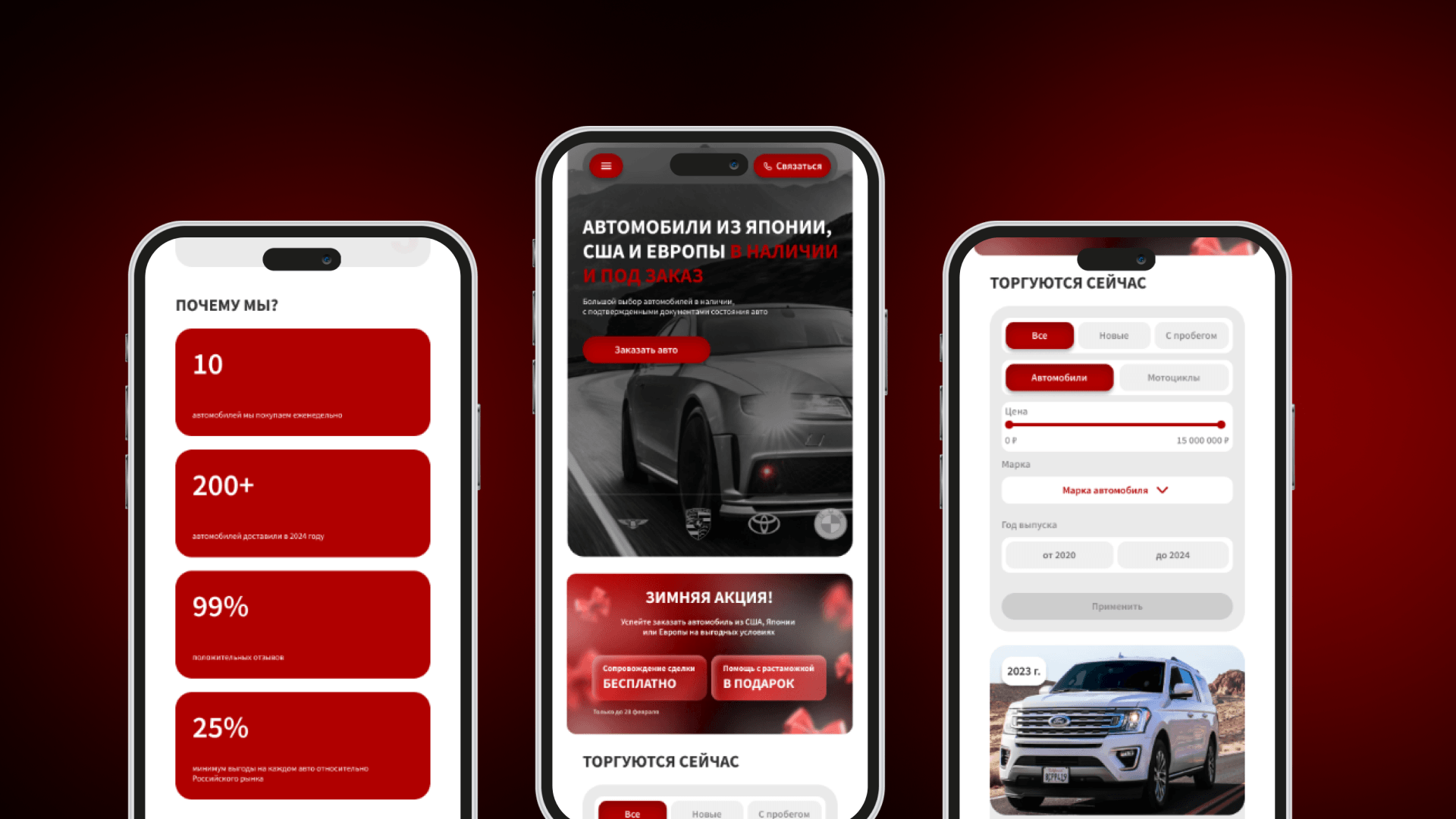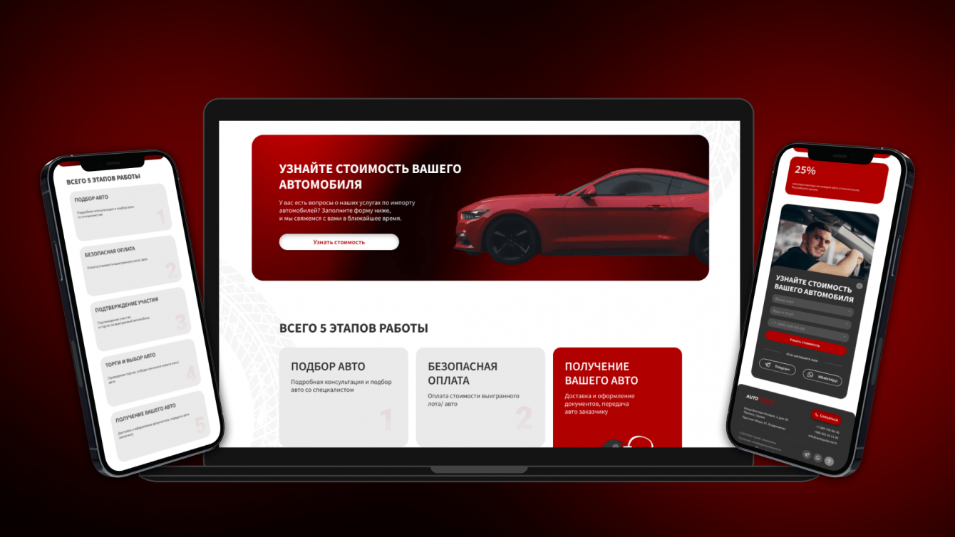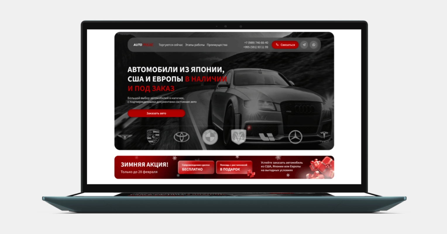 В результате нашей работы над ленд-страницей для компании, занимающейся продажей автомобилей из-за границы, был создан привлекательный и функциональный сайт, который эффективно представляет ассортимент автомобилей и способствует увеличению продаж. Мы разработали интуитивно понятный интерфейс с современным дизайном, который акцентирует внимание на уникальных предложениях и обеспечивает комфортную навигацию для пользователей