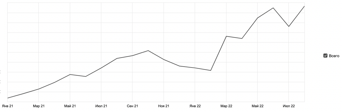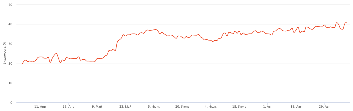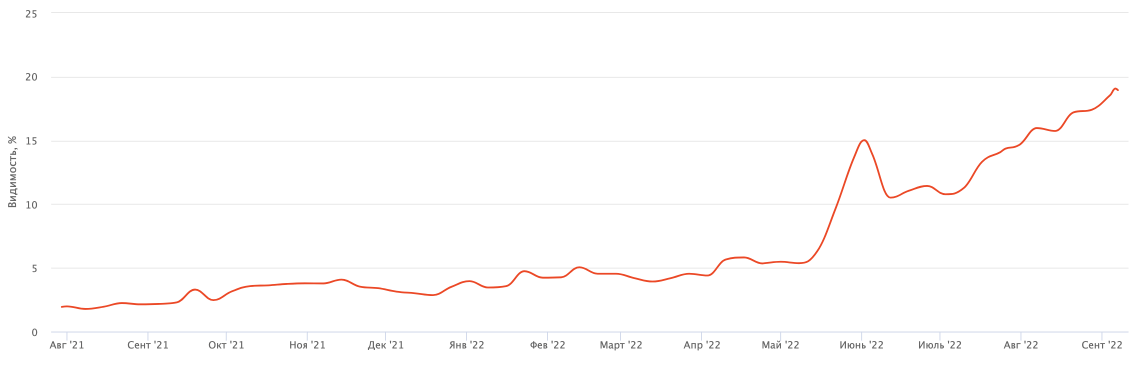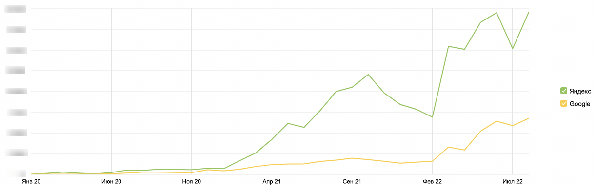 Через три месяца после запуска, к июню 2021 года, раздел начал давать результаты — стали появляться первые позиции в выдаче. Начался прирост трафика в обеих поисковых системах. Преимущественно в Яндексе, потому что там выдача коммерческая, а в Google — смешанная. Трафик увеличился с Х визитов до 20Х.