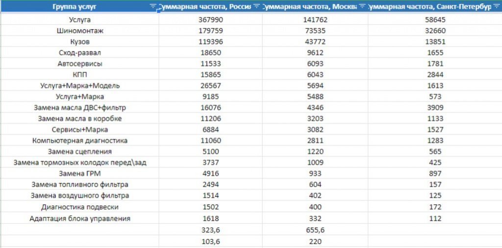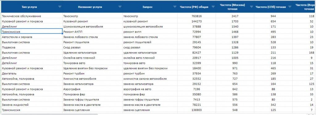Видимость в Google по приоритетным маркам раздела технического обслуживания: