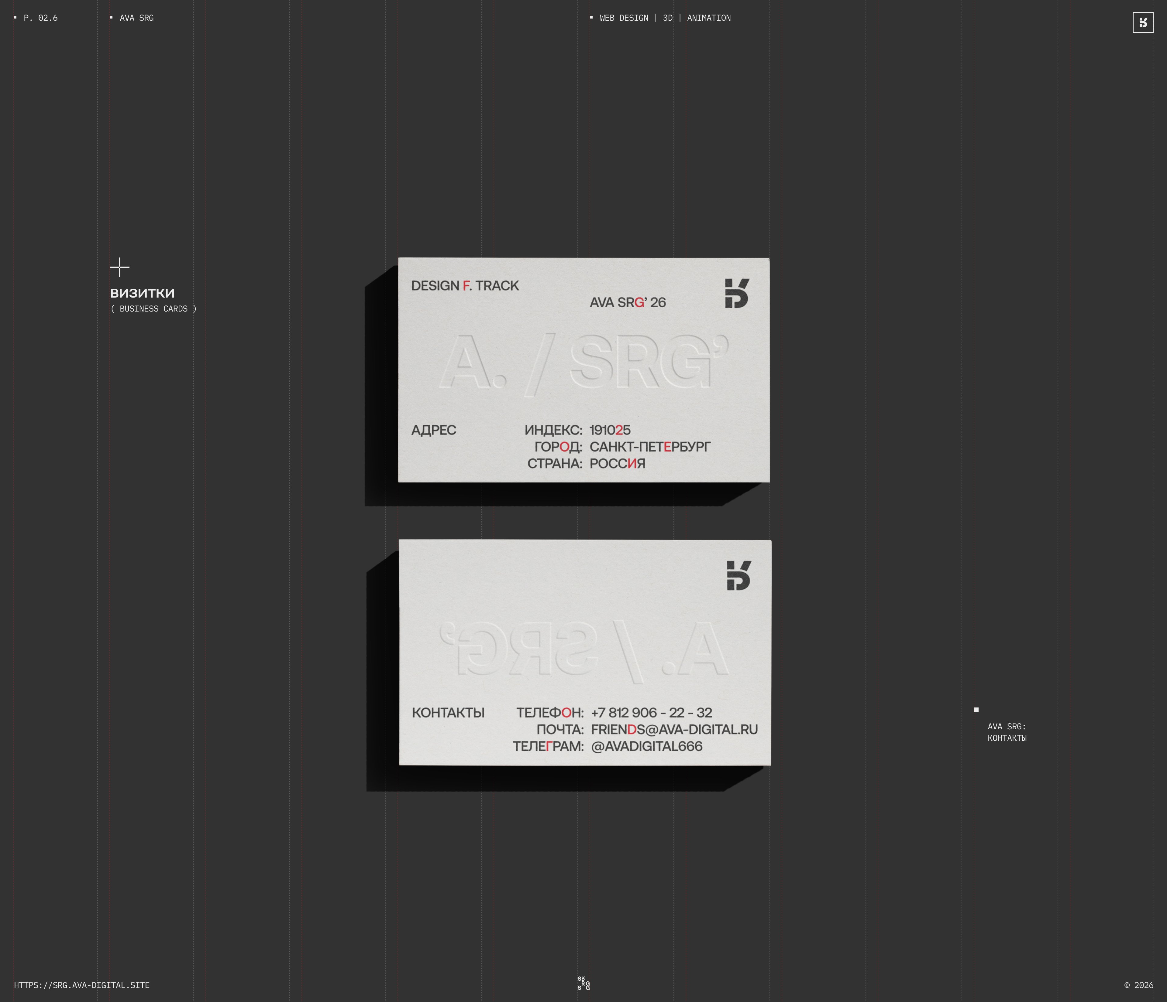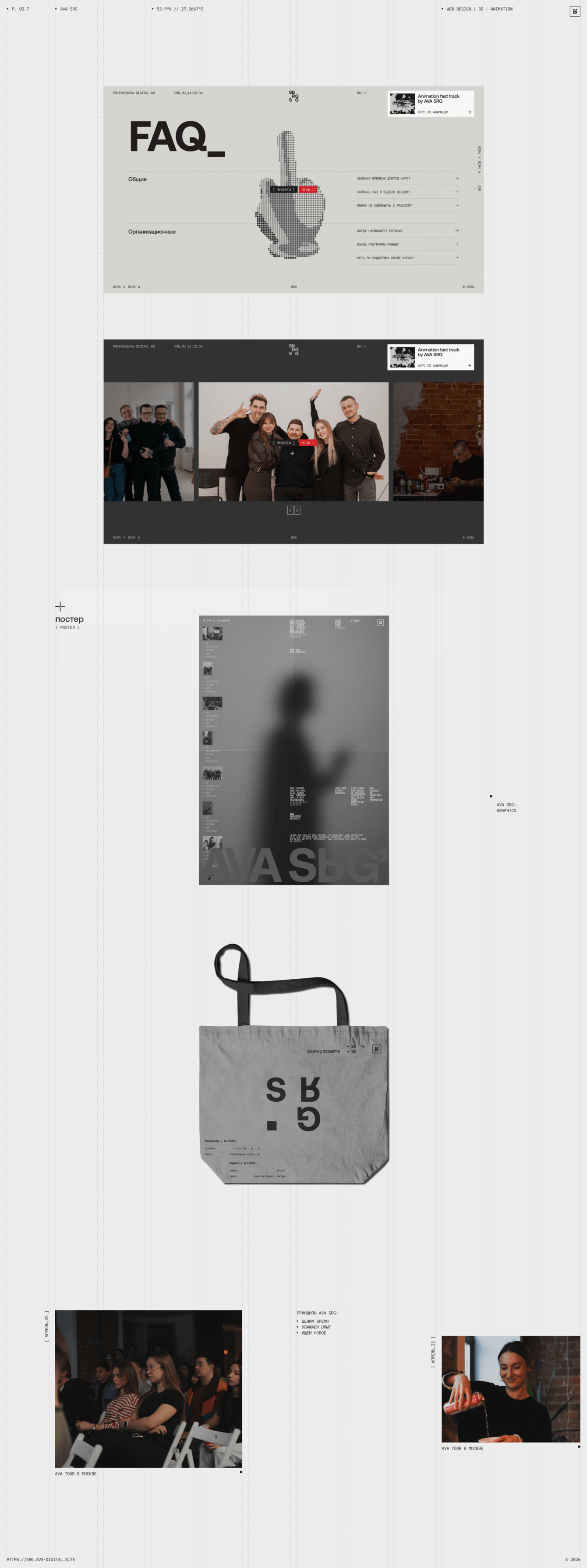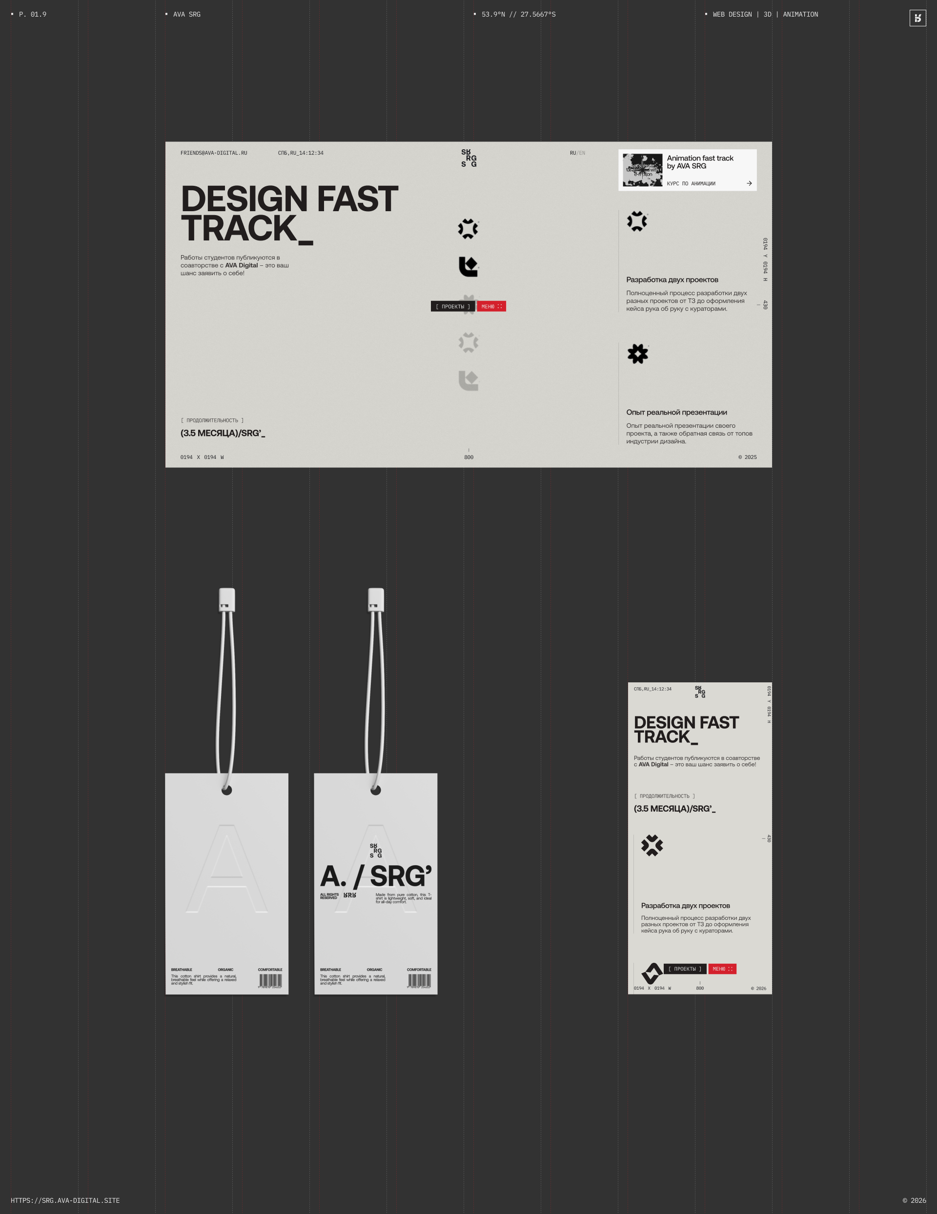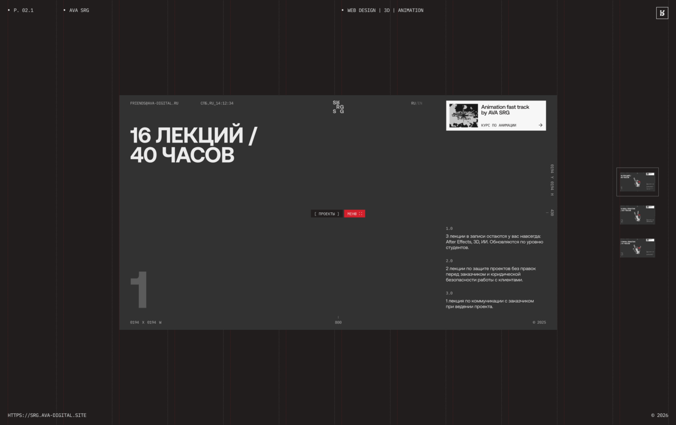 Сайт для дизайнеров не может обойтись без фишек — где, как не здесь, демонстрировать свое мастерство? Мы добавили несколько пасхалок: например, логотип SRG при скролле постоянно пересобирается, буквы переставляются местами. Эта метафора отражает трансформацию наших студентов во время обучения. Координаты курсора по периметру сайта, как на макете, позволяют посетителю почувствовать себя дизайнером.