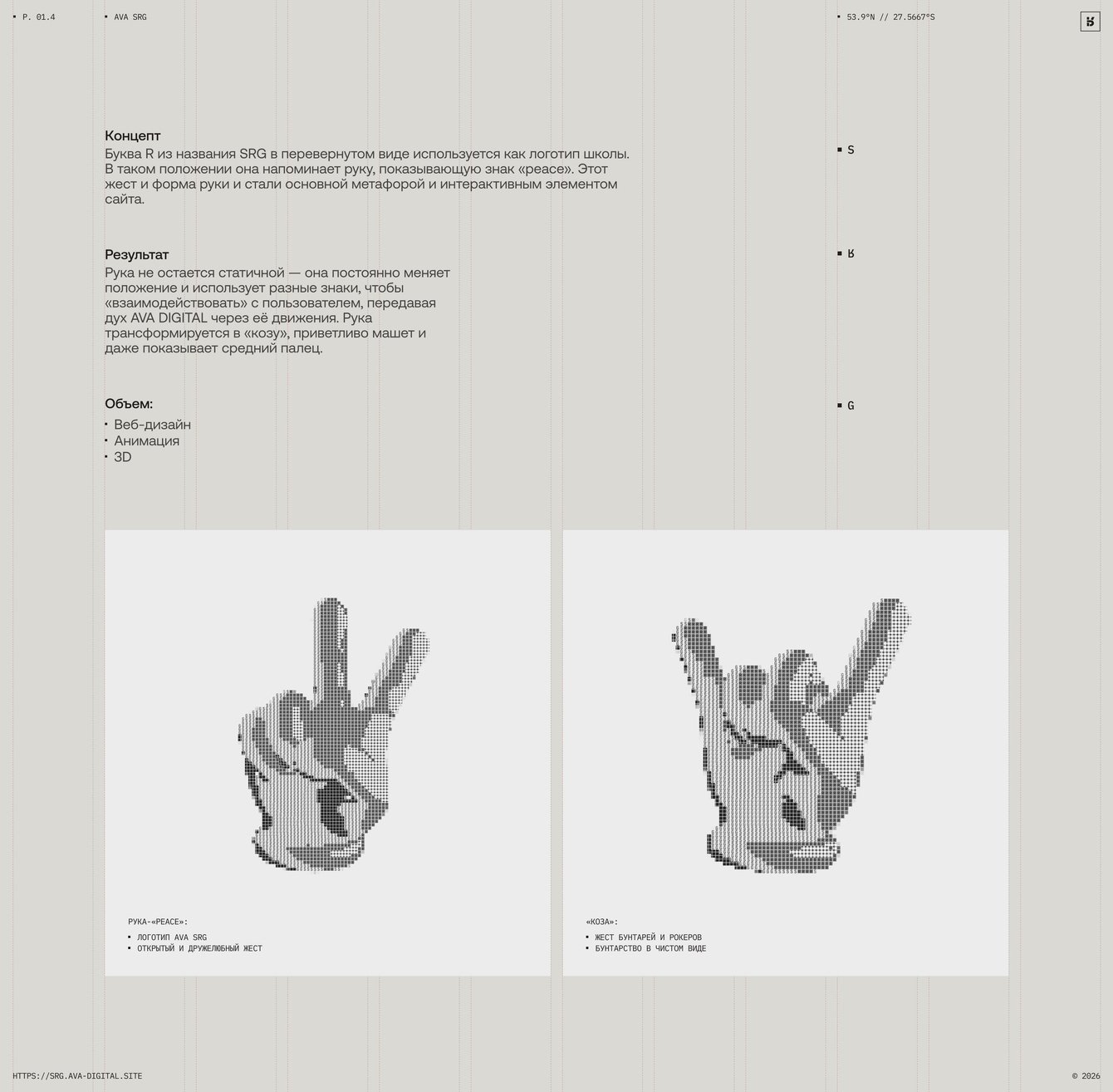 Жест, которым встречает SRG — это «peace», отсылающий к перевернутой R на логотипе. 3D-модель руки стала визуальным проводником по всему сайту. Она взаимодействует с разными экранами уникальным образом: по-рокерски складывает пальцы в «козу», демонстрирует логотипы конкурсов, считает этапы обучения. И, конечно, показывает FAQ — то есть средний палец.