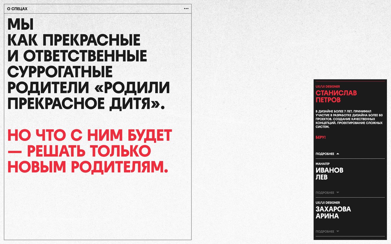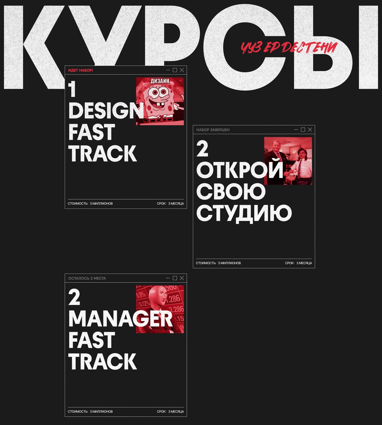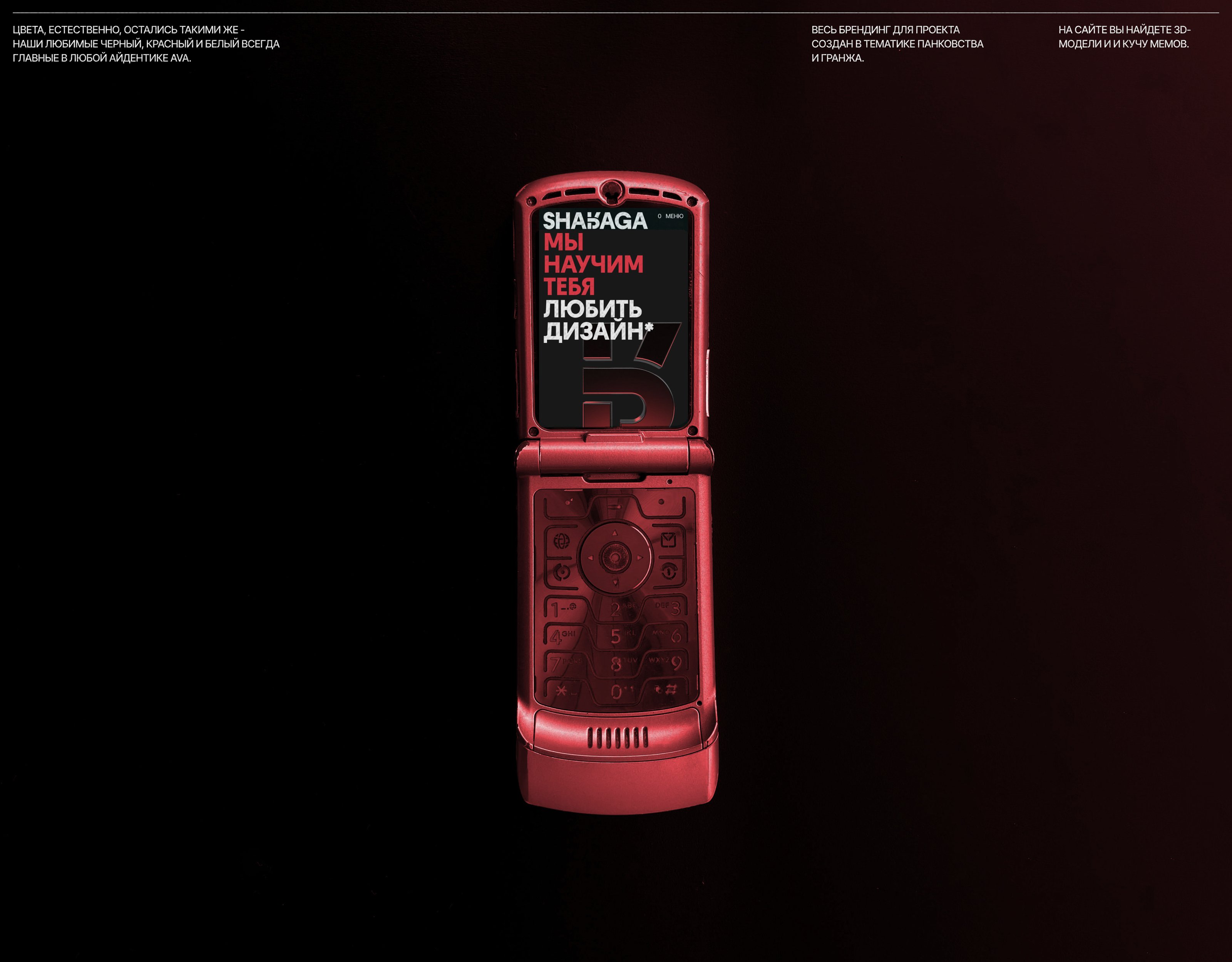 Весь брендинг для проекта создан в тематике панковства и гранжа - везде текстуры, потертости, смелые формы и сильные решения. Этой же концепции придерживается сайт - вы найдете там необычные 3D-модели, матерные заголовки на всю страницу и кучу мемов.