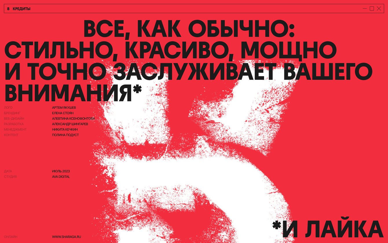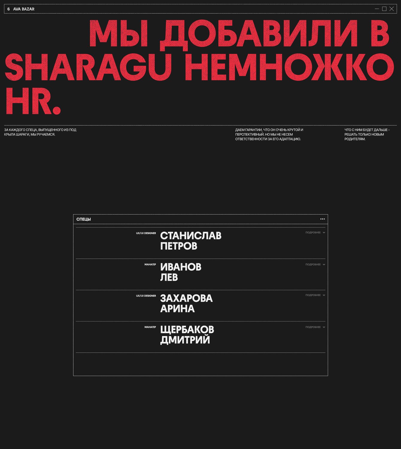 Еще вы сможете посмотреть фильм про нашу идею и историю создания SHARAGA, а другие студии смогут подыскать себе новых сотрудников в разделе Ava Bazar, где мы будем делиться самыми крутыми кандидатами на должность в рядах дизайнеров, менеджеров и других digital-специальностях.
