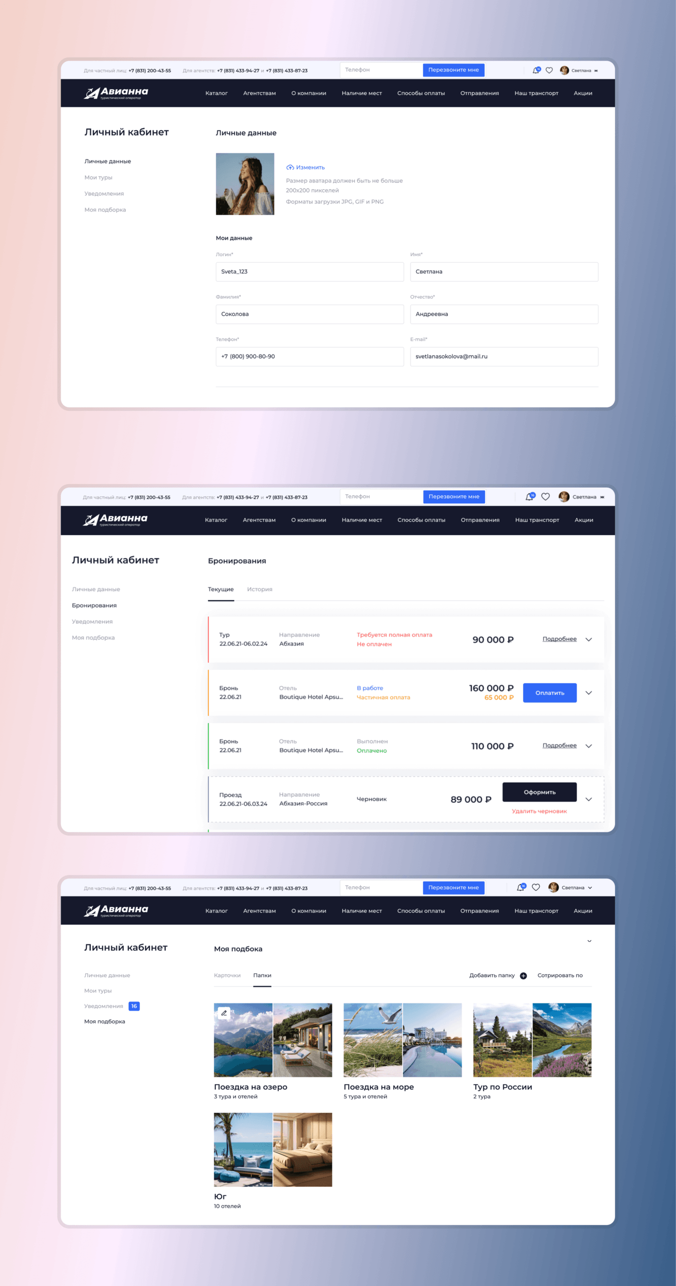 В личный кабинет туриста - помимо базовой личной информации о пользователе - мы добавили блок с "Моими бронированиями" и сделали "Подборки", где можно собрать свои уникальные поездки и отсортировать их по папкам.