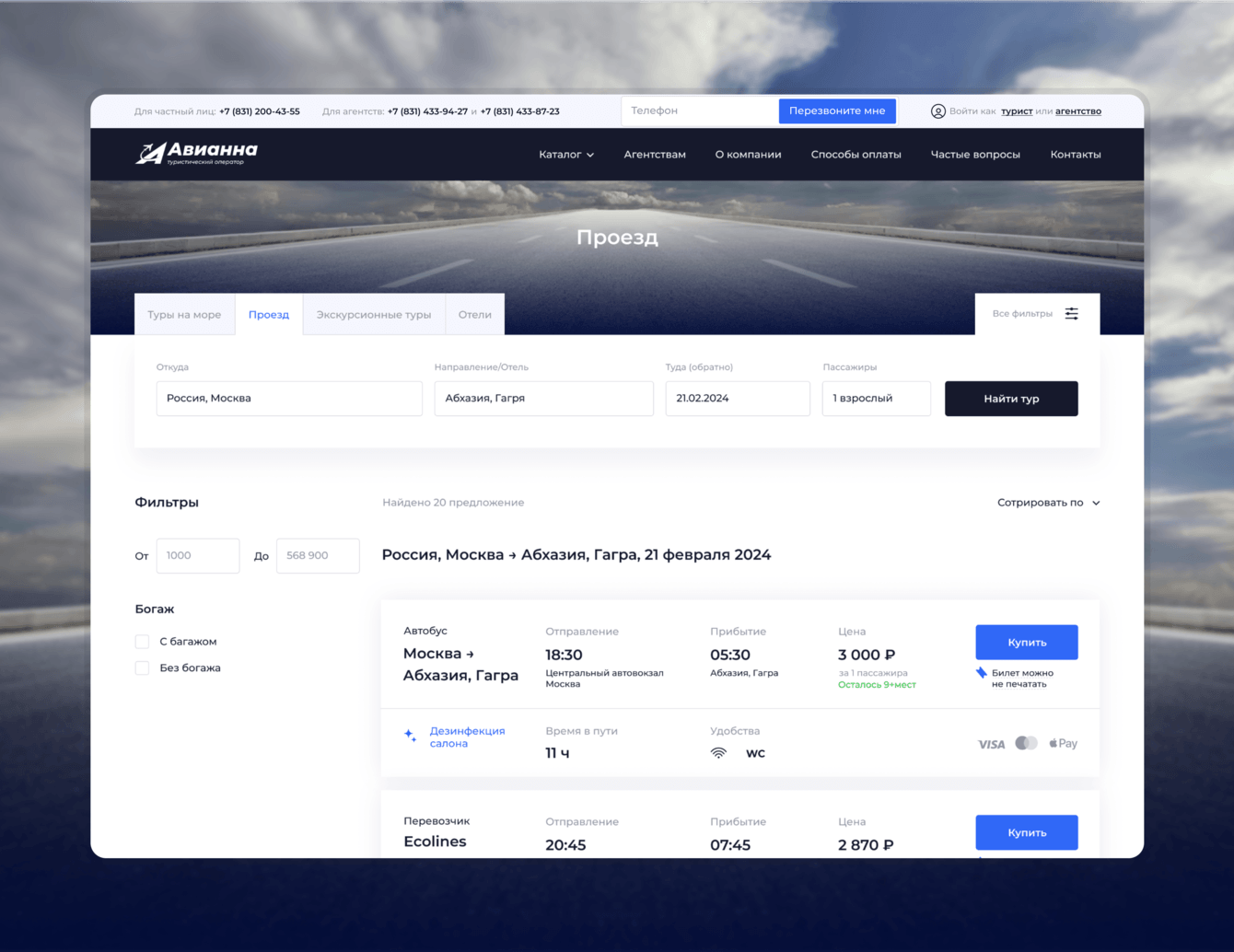 Также мы интегрировали в сайт возможность поиска и покупки билетов на автобус, где пользователь может выбрать интересующее его направление, дату, выбрать подходящий для него рейс и место в автобусе.