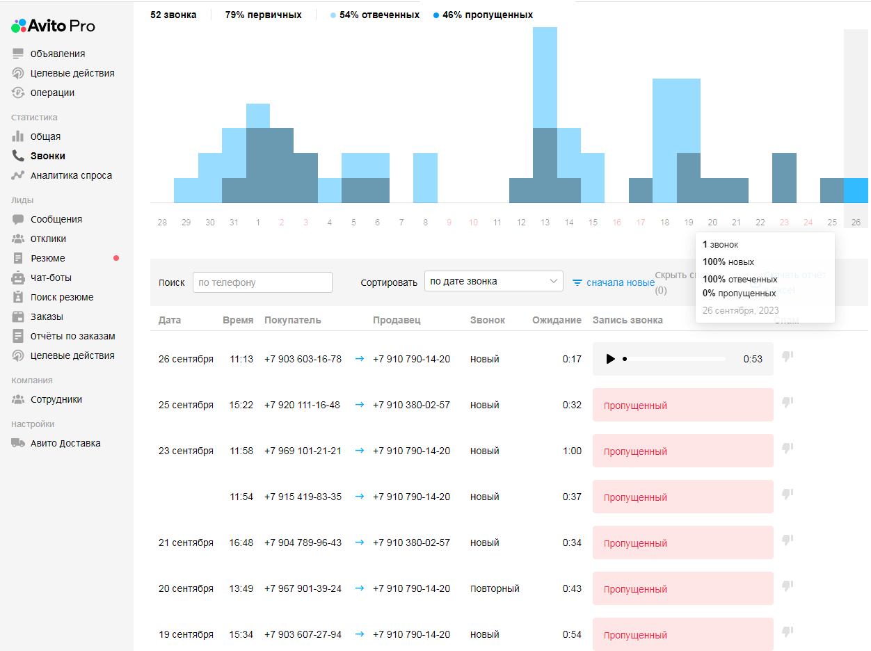 ● Клиент получает детализированный результат по воронке продаж на Авито: