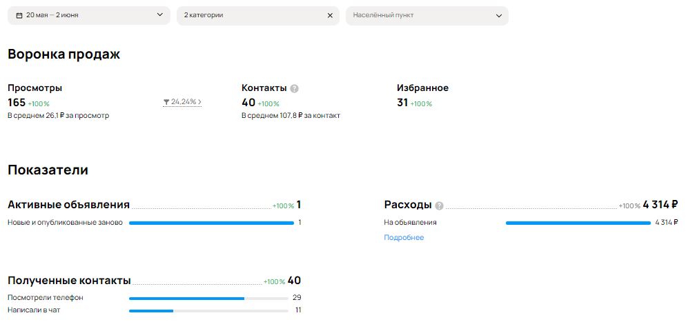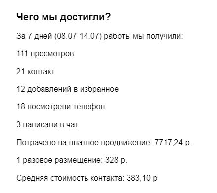 • Еженедельно клиент получал подробные отчёты по просмотрам, контактам, средней стоимости обращения;
