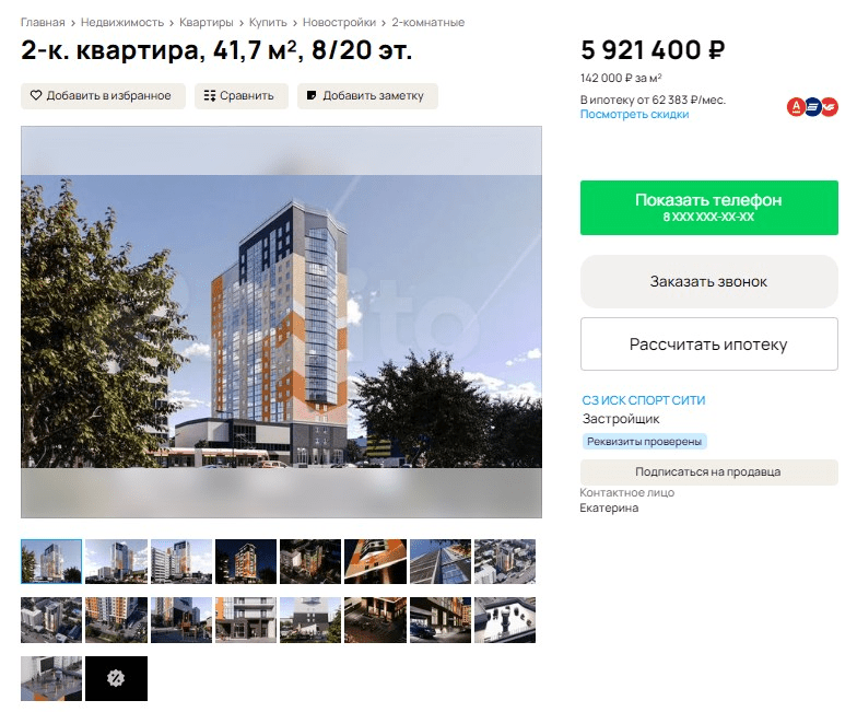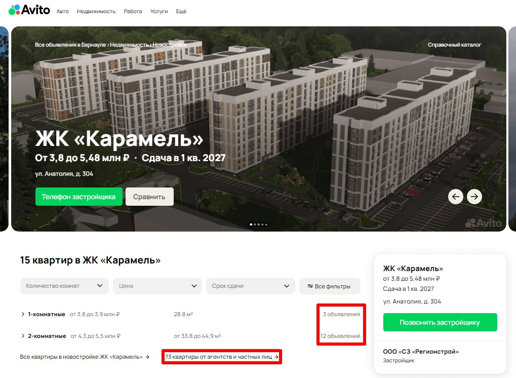 Часто встречаем карточки новостроек, в которых до 20 объявлений от застройщика и большая доля от частников: